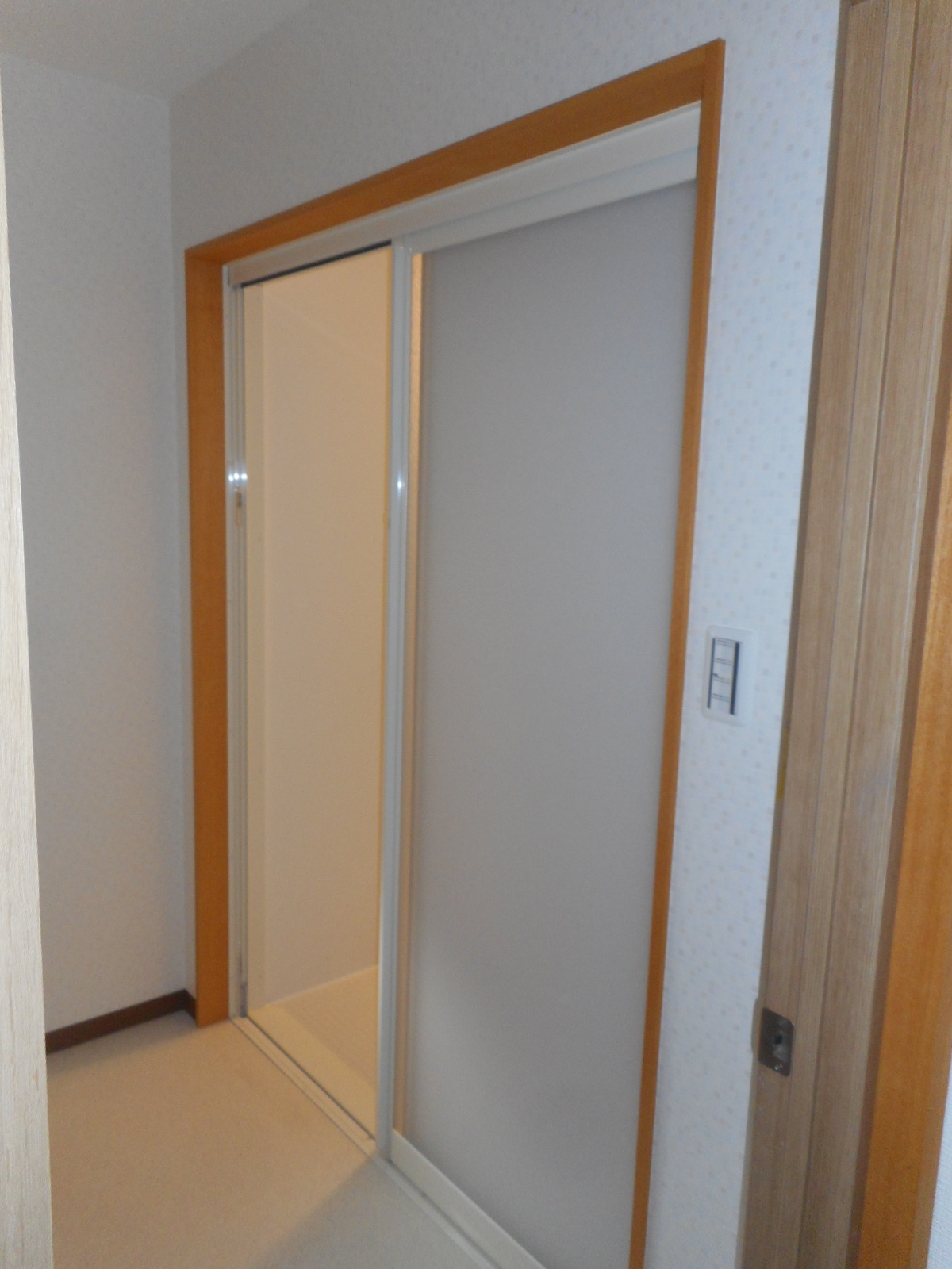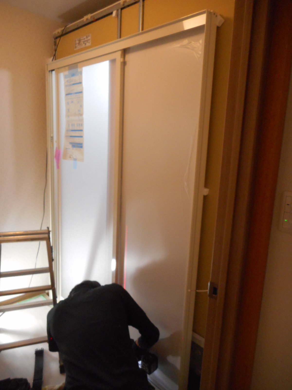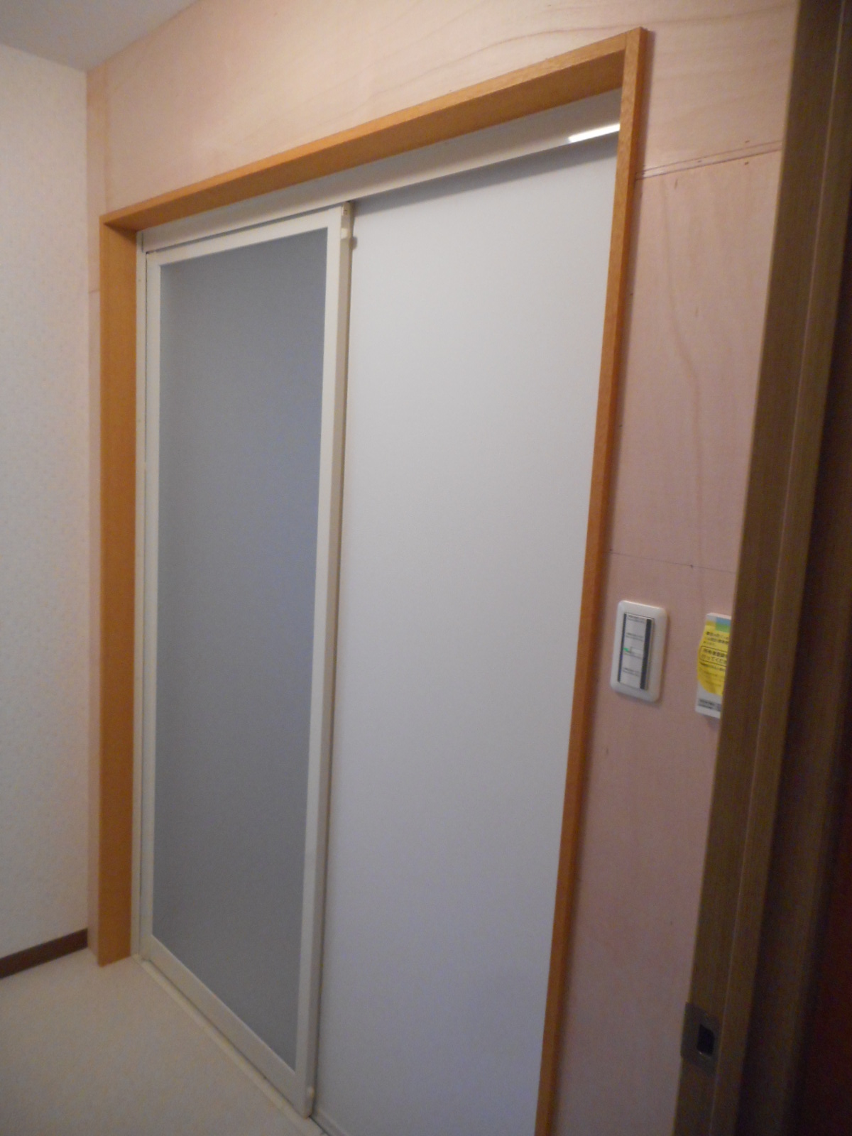 | 入り口の片引き戸を、組付けます!! | 引き戸廻りに化粧枠を施工し、クロス下地の壁の造作をしました!! |