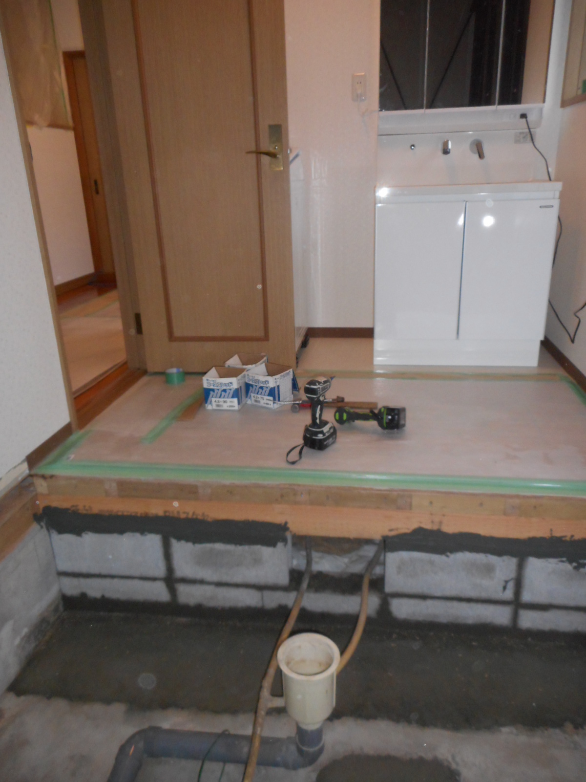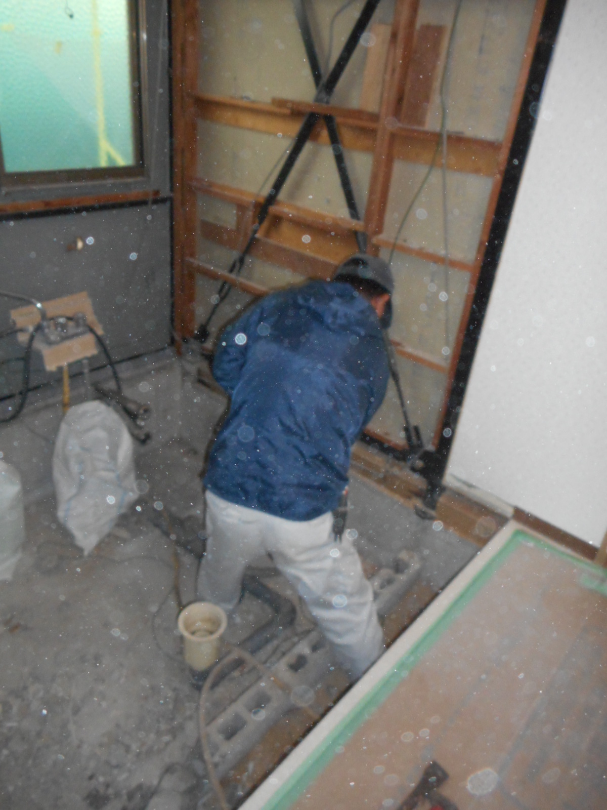 | 洗面所側に広げる分の床のカット後、根太や土台も解体、撤去します!! | 浴室と洗面所との既存の境界の基礎ブロックも<解体、撤去します!! |
