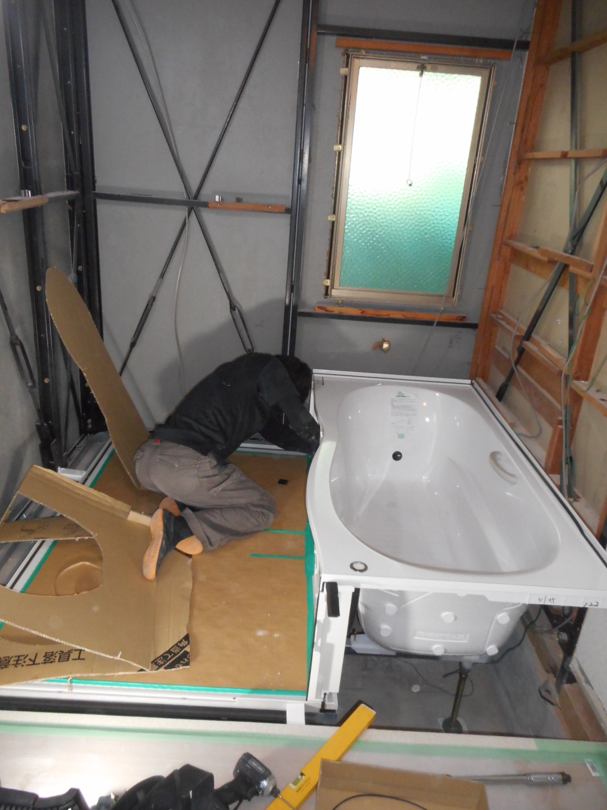 | 洗い場と浴槽を、据付けて行きます!! | 天井と壁パネルを、組付けます!! |
