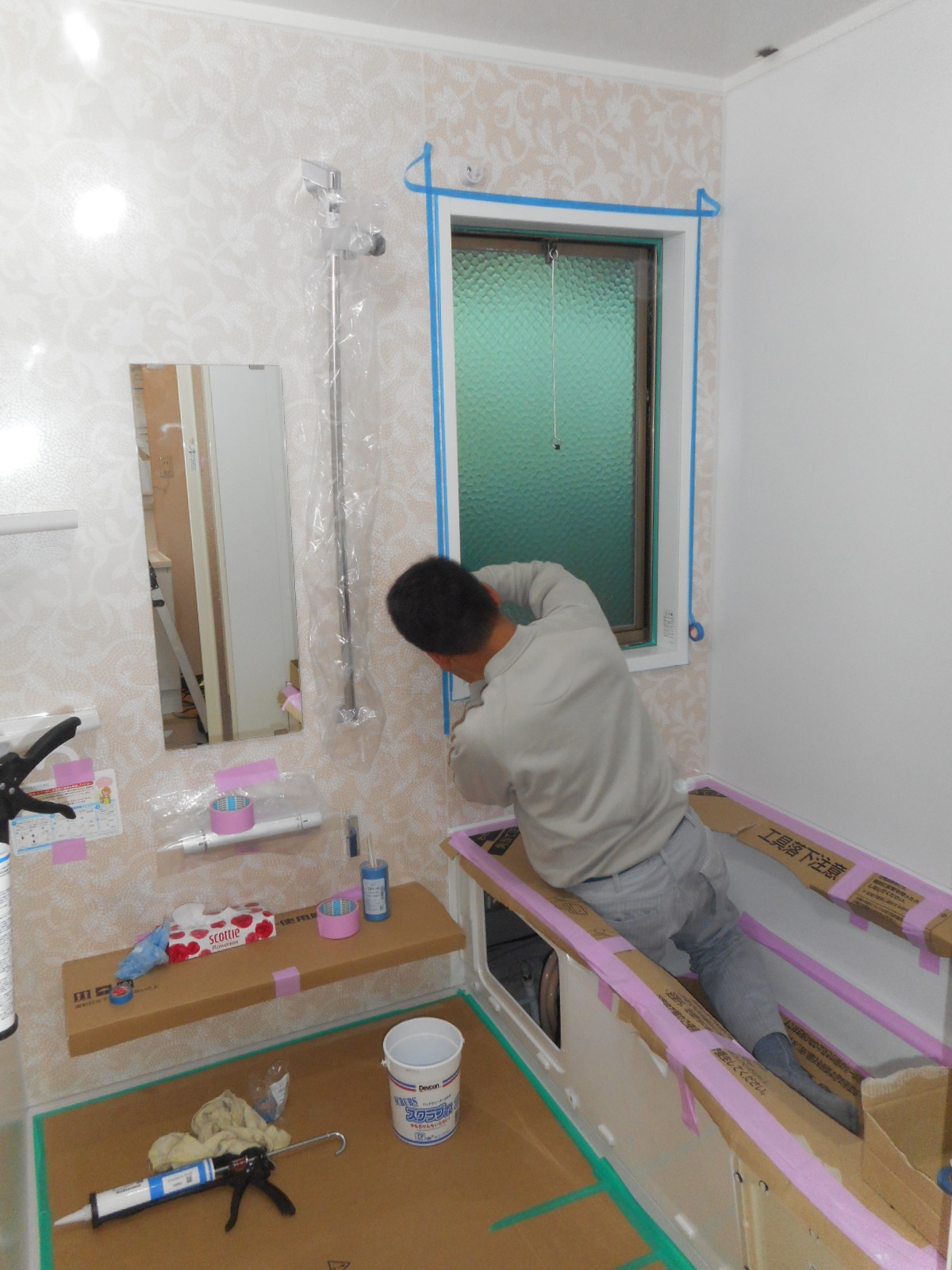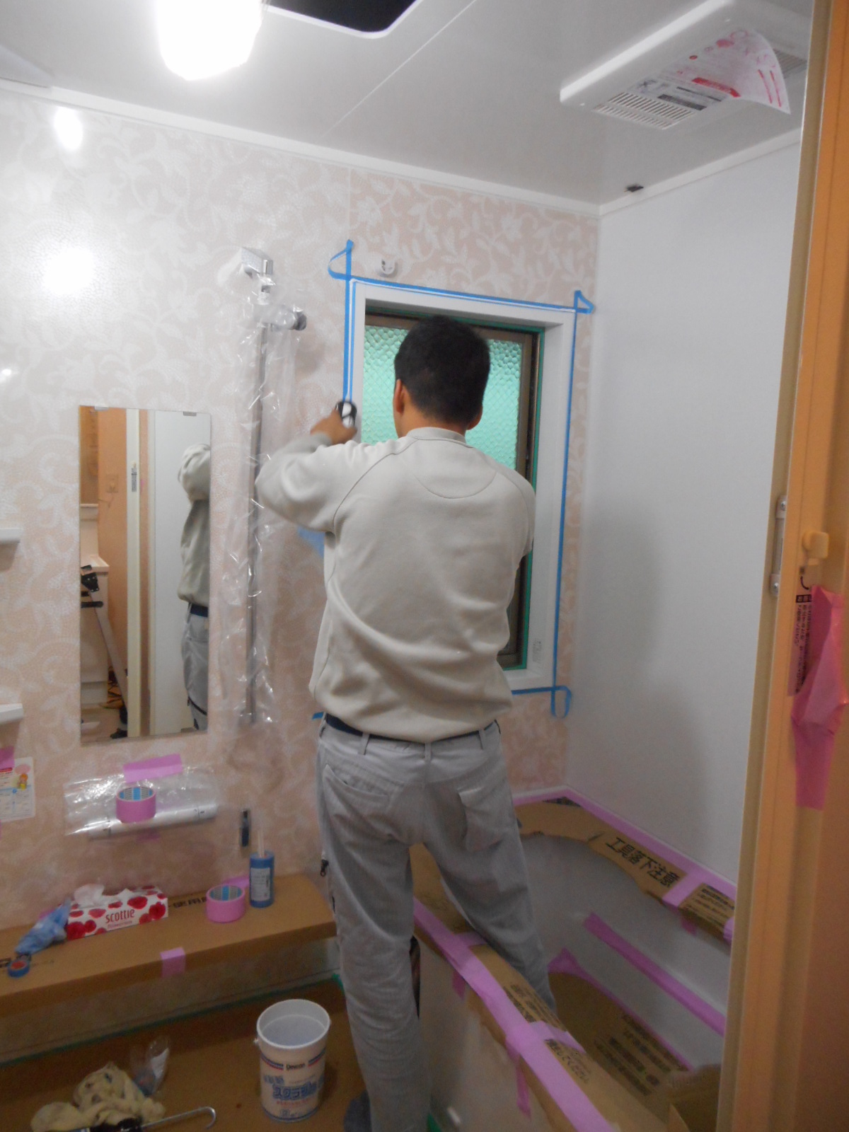 | カウンター、鏡、シャワー水栓、窓枠等の備品を取付け、仕上げのコーキングを打つ前の養生をします!! | 仕上げのコーキンングを、打って行きます!! |
