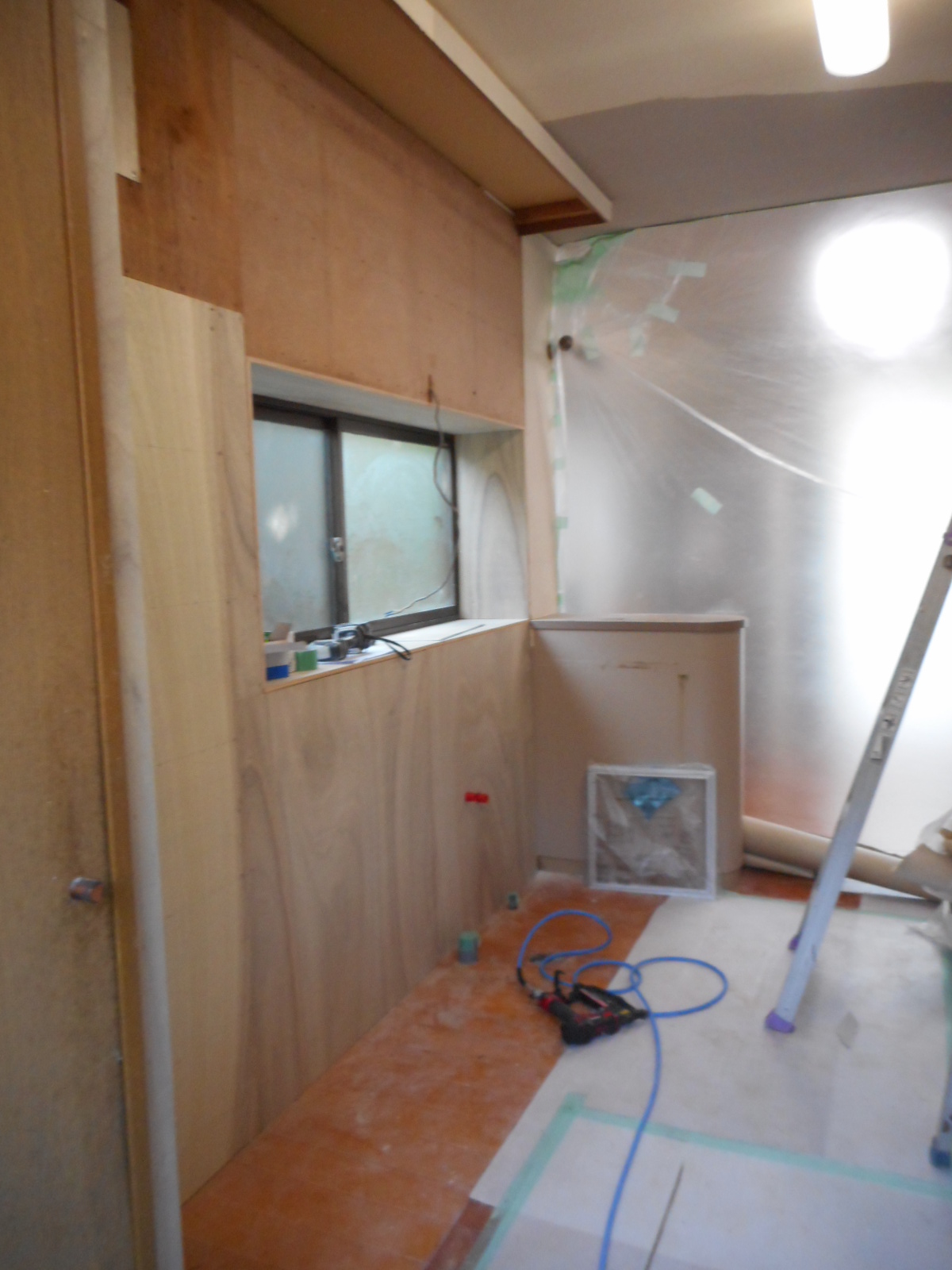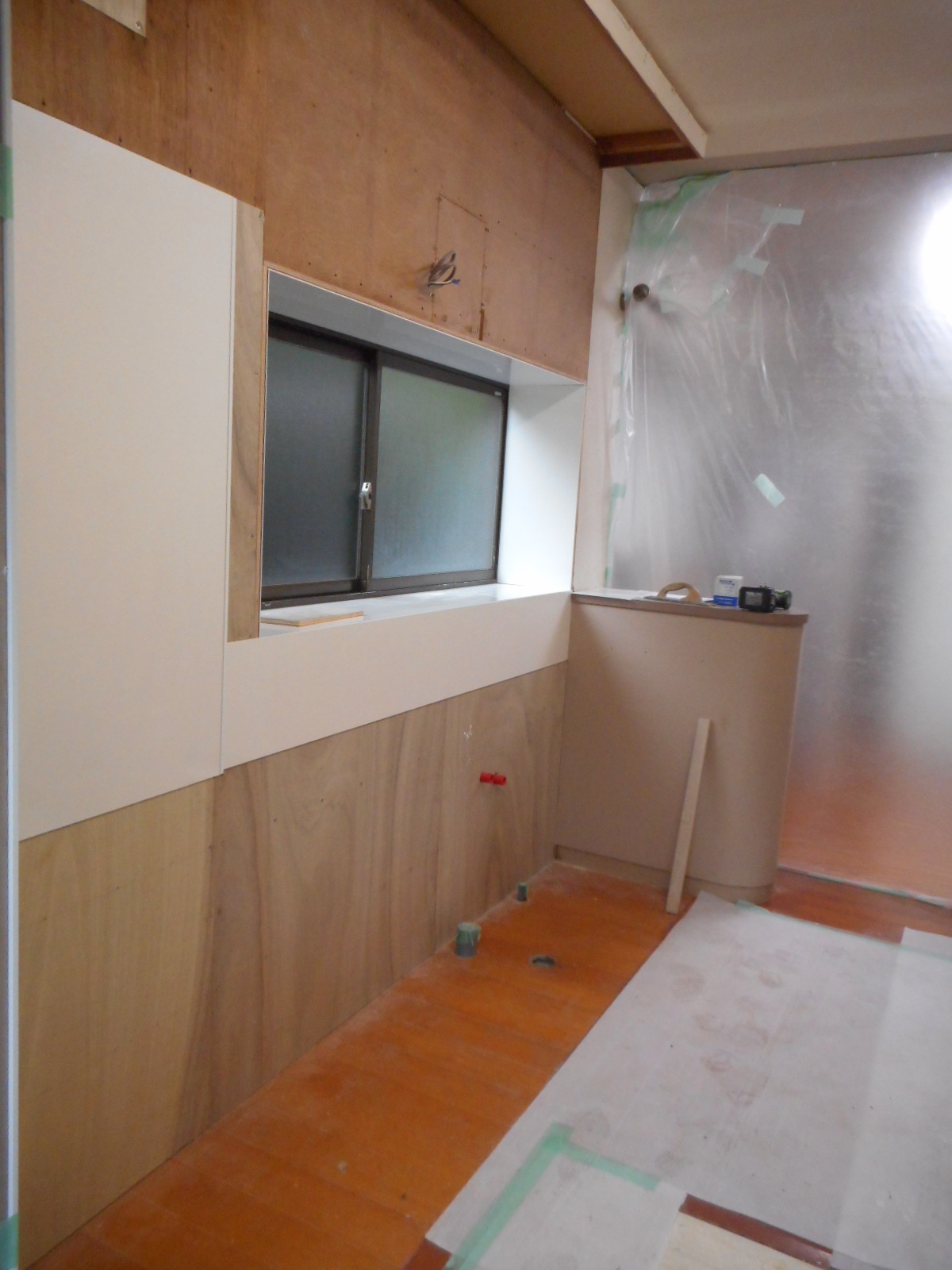 設備屋さんの配管等の移設,整備も、完了しました!! キッチンパネルの施工も、完了です!!