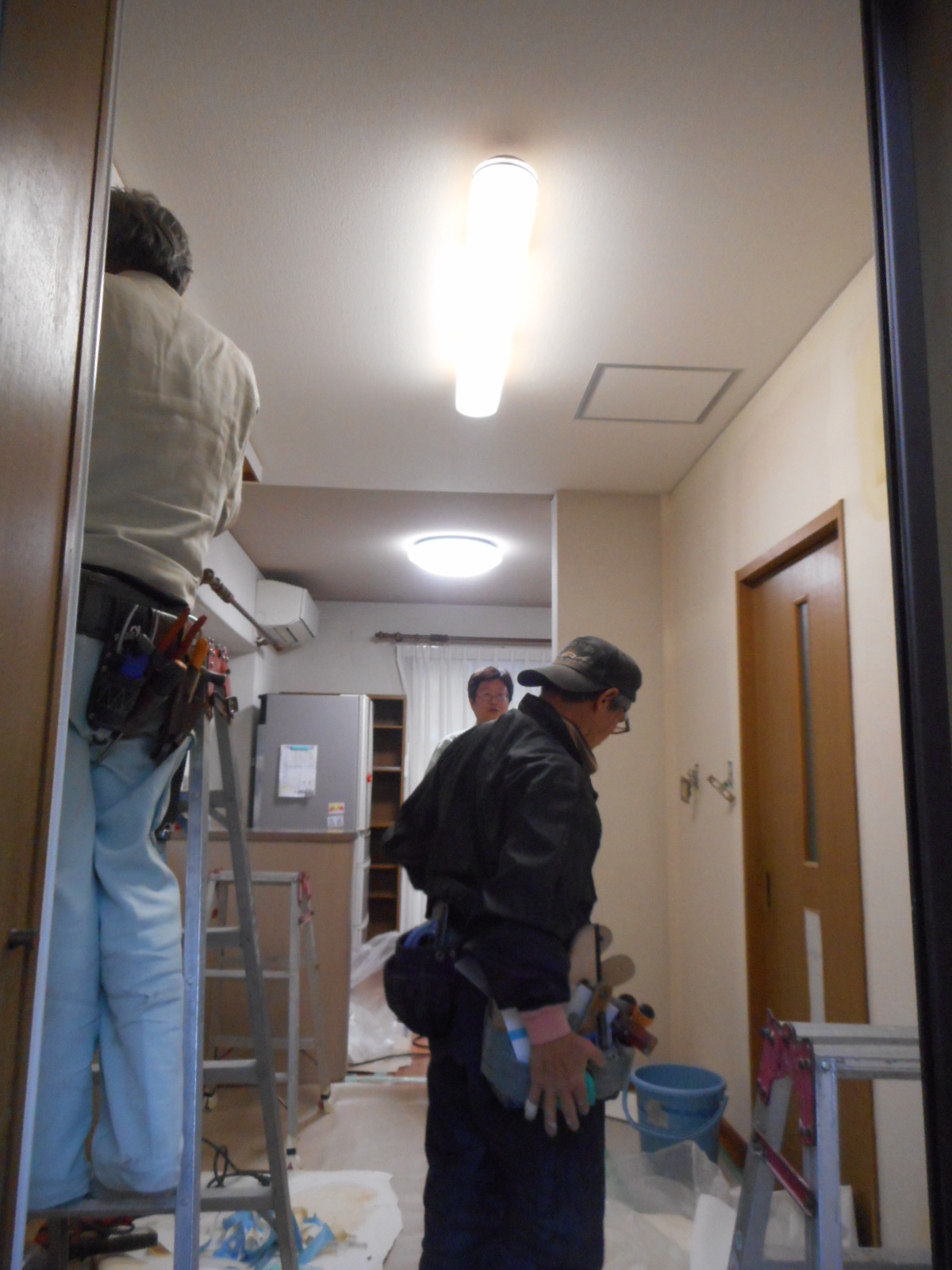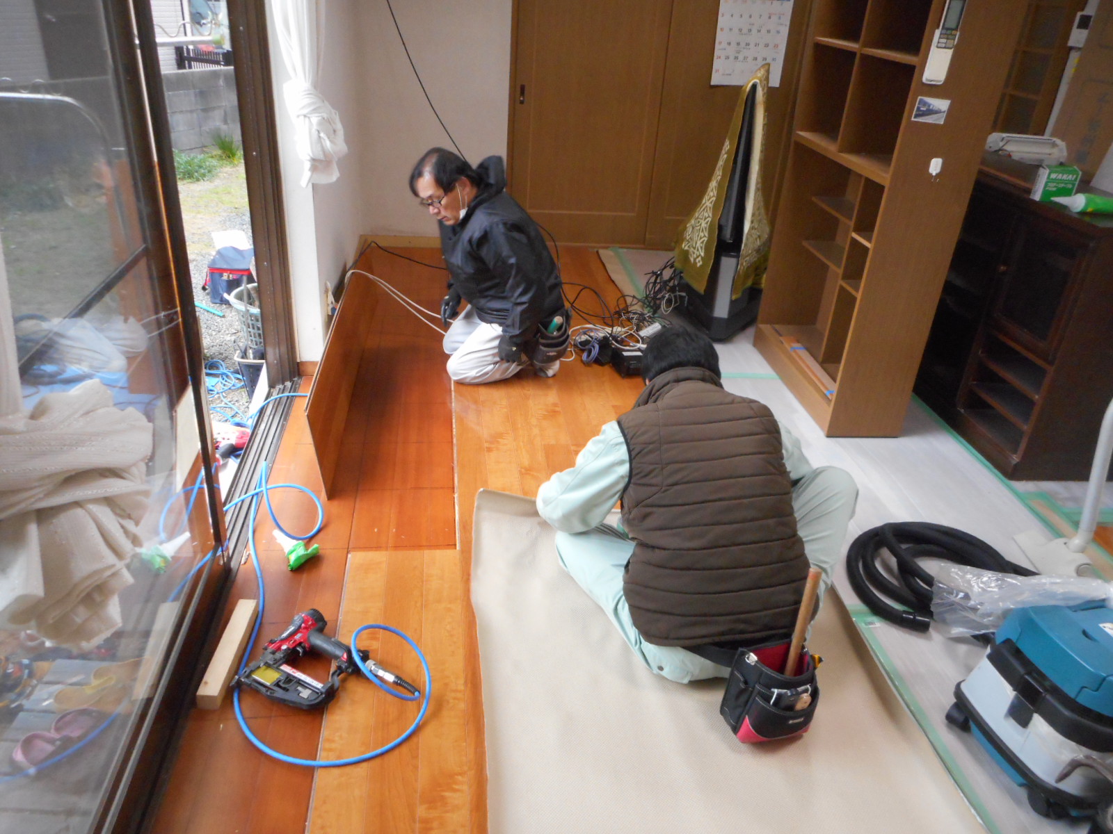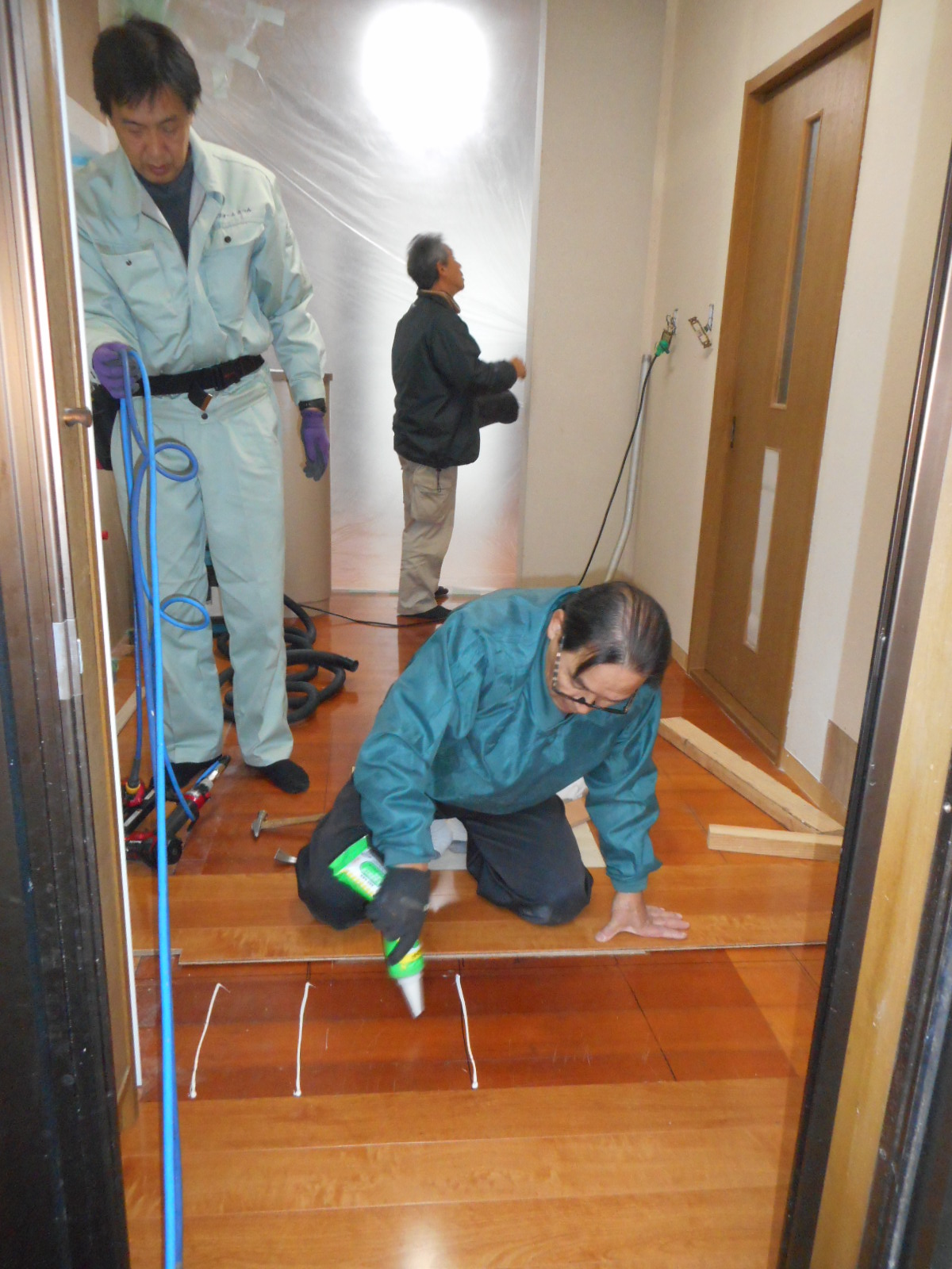 新規フロア材を既存上部より、増し張りします!! 電気屋さんが換気扇廻りの改修と、クロス屋さんが