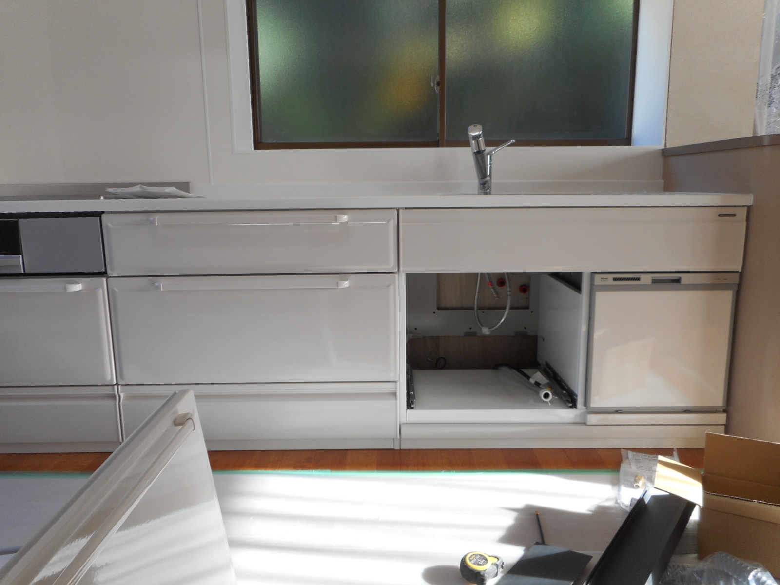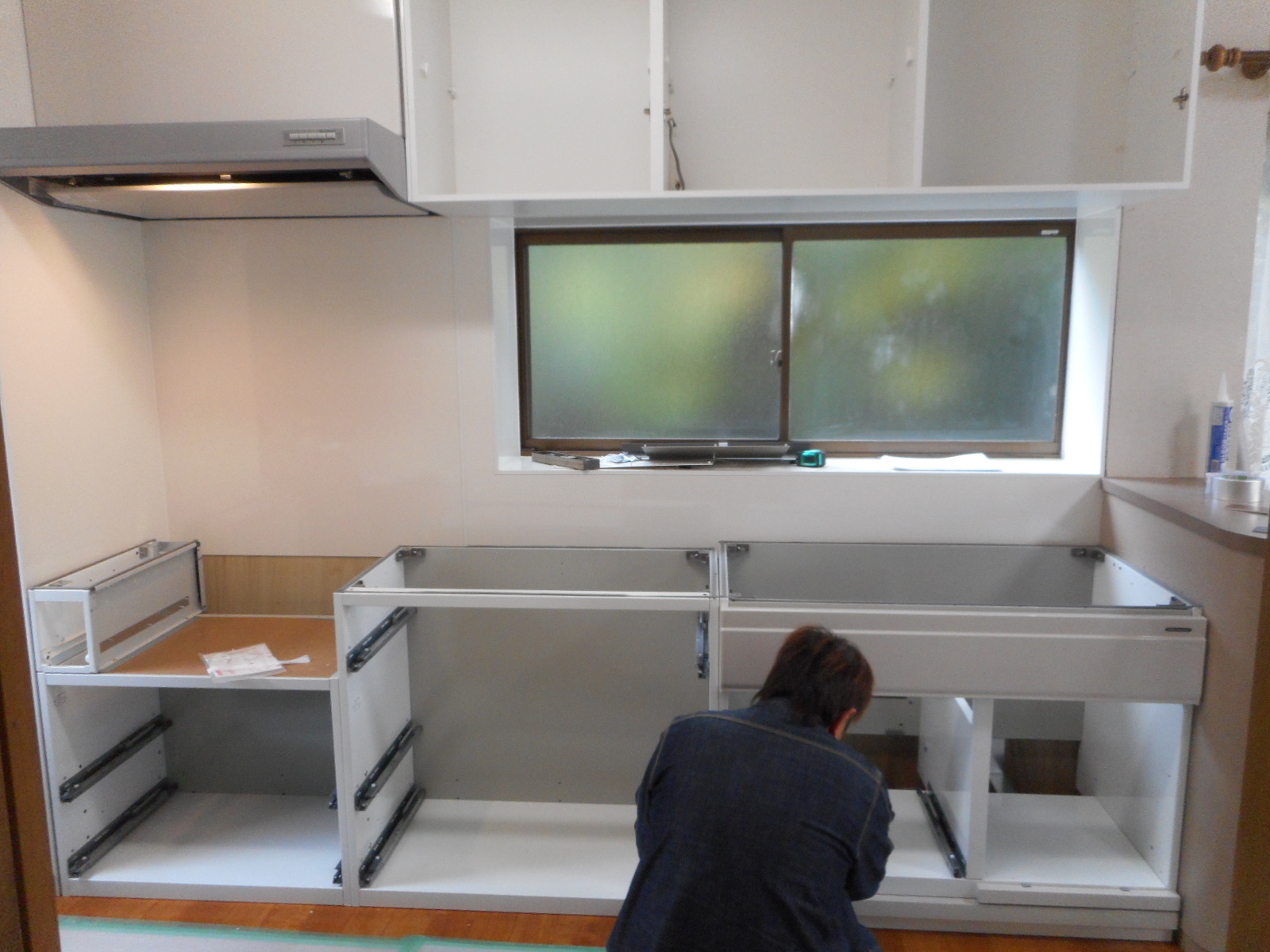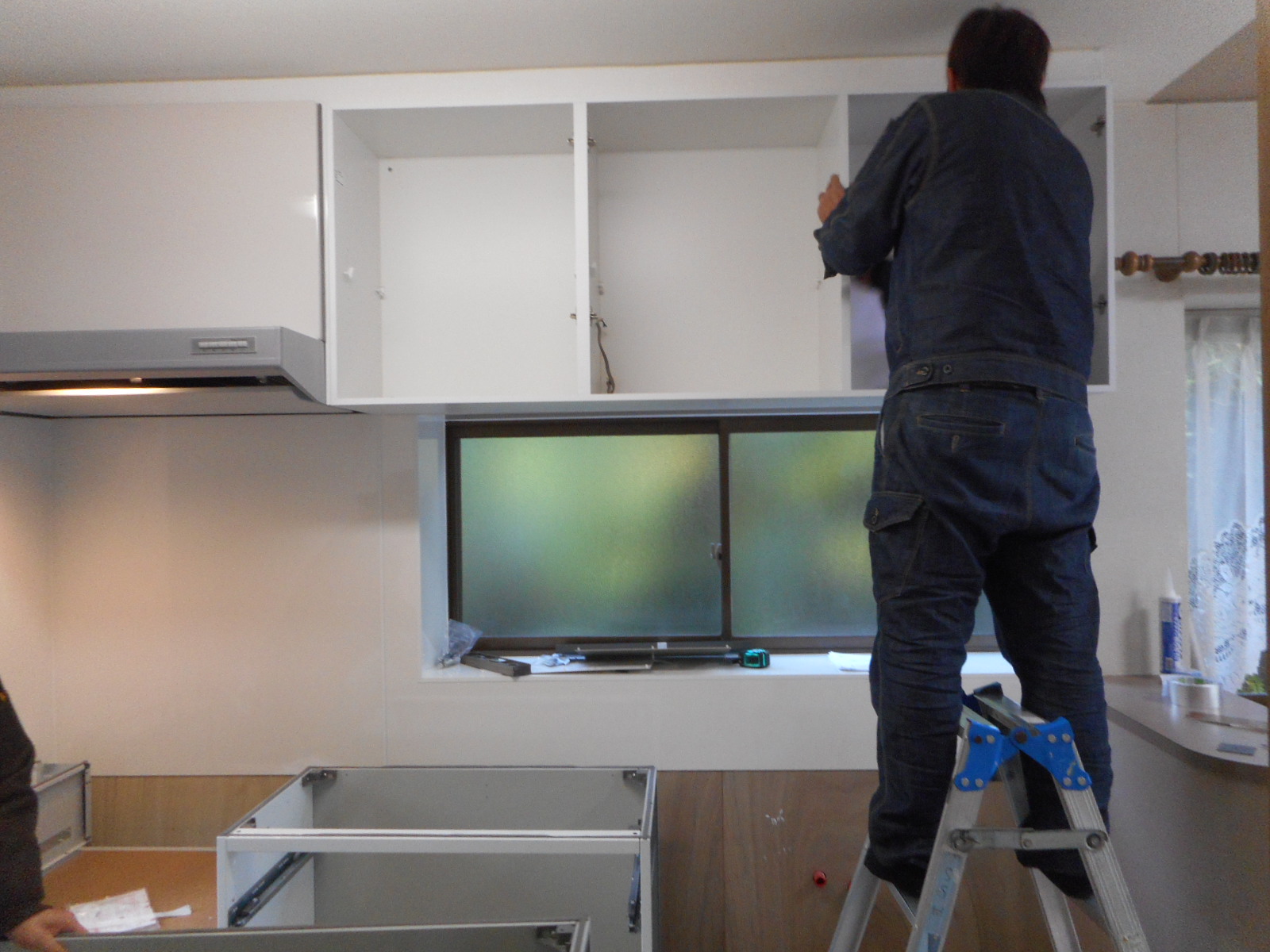 左に換気フードを、続いて吊戸棚を組付けて行きます!! 下の流し台部分も、順次組付けて行きます!!