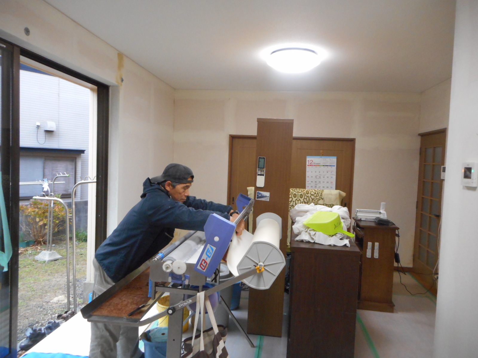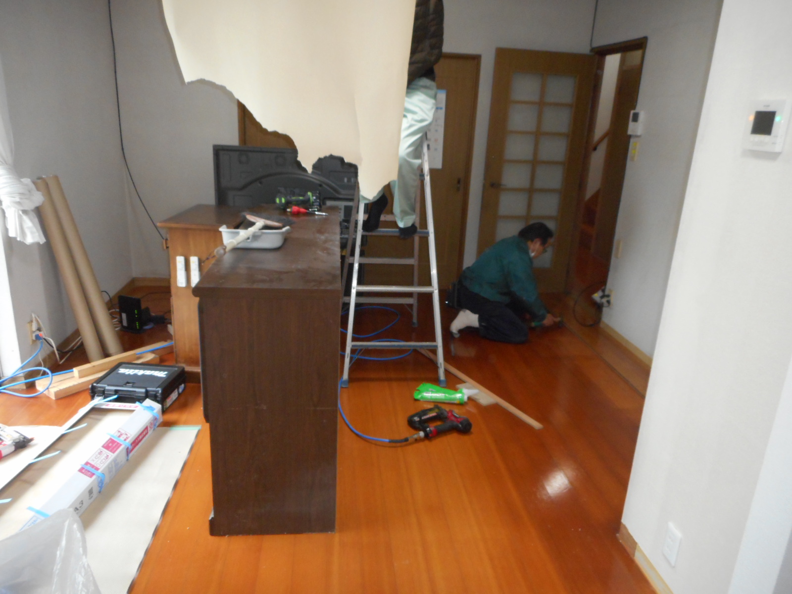 既存上部より順次新規フロア材を、施工して行きます!! クロス屋さんが、天井と壁廻りのクロスを張替えています!!