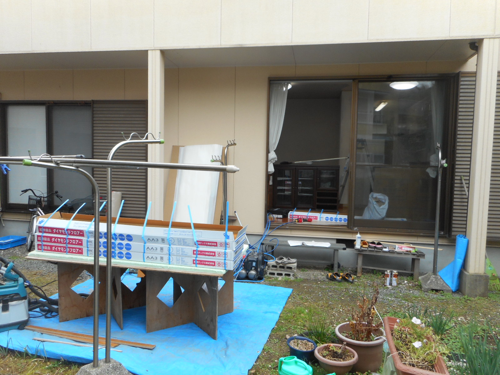 天井の既存のクロス剥ぎと、床の下地整備をしています!! 外の庭で、フロア材の加工をします!!
