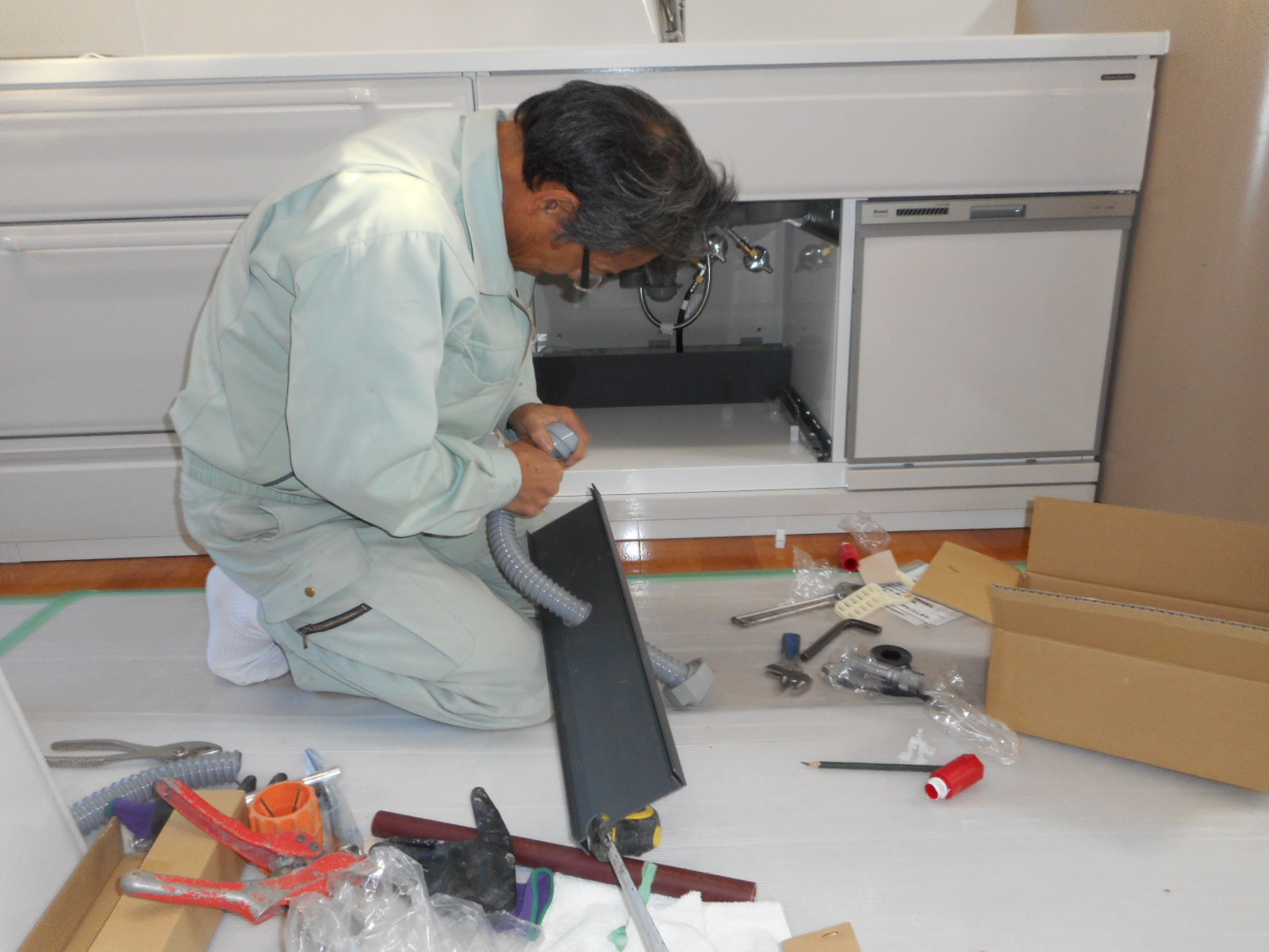 組付けが終わったら、次は設備屋さんの出番です!! 各配管の接続と、食洗機用の給排水の