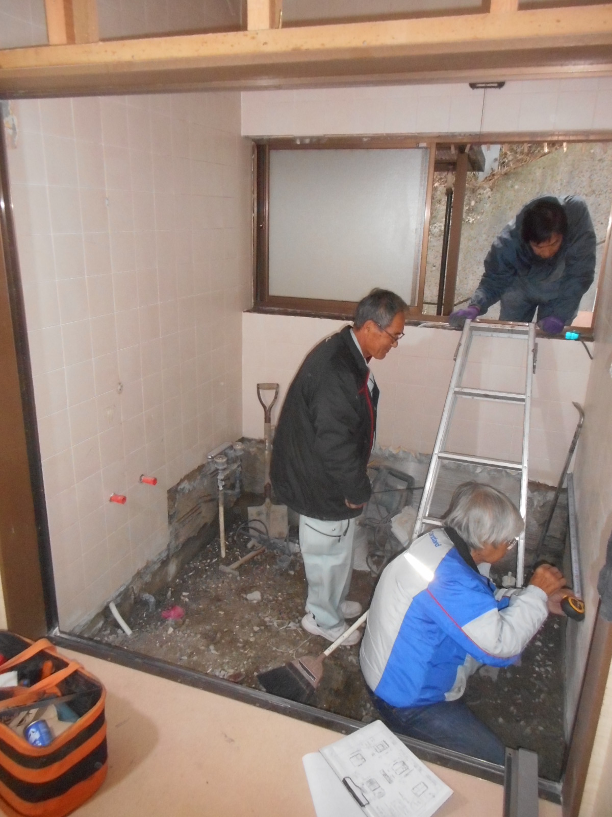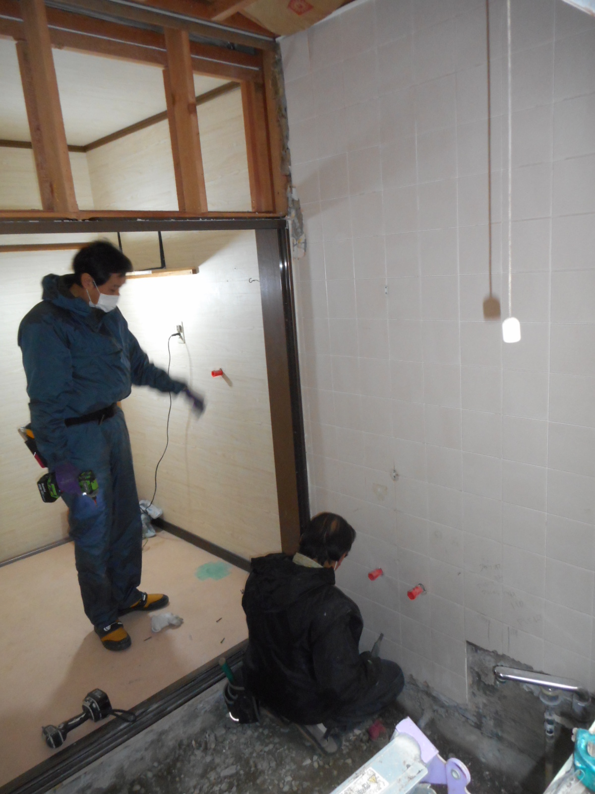 | 大工さんが、脱衣所側に広げる造作をします!! | タカラさんの工務の方が来て、墨だしをします!! |