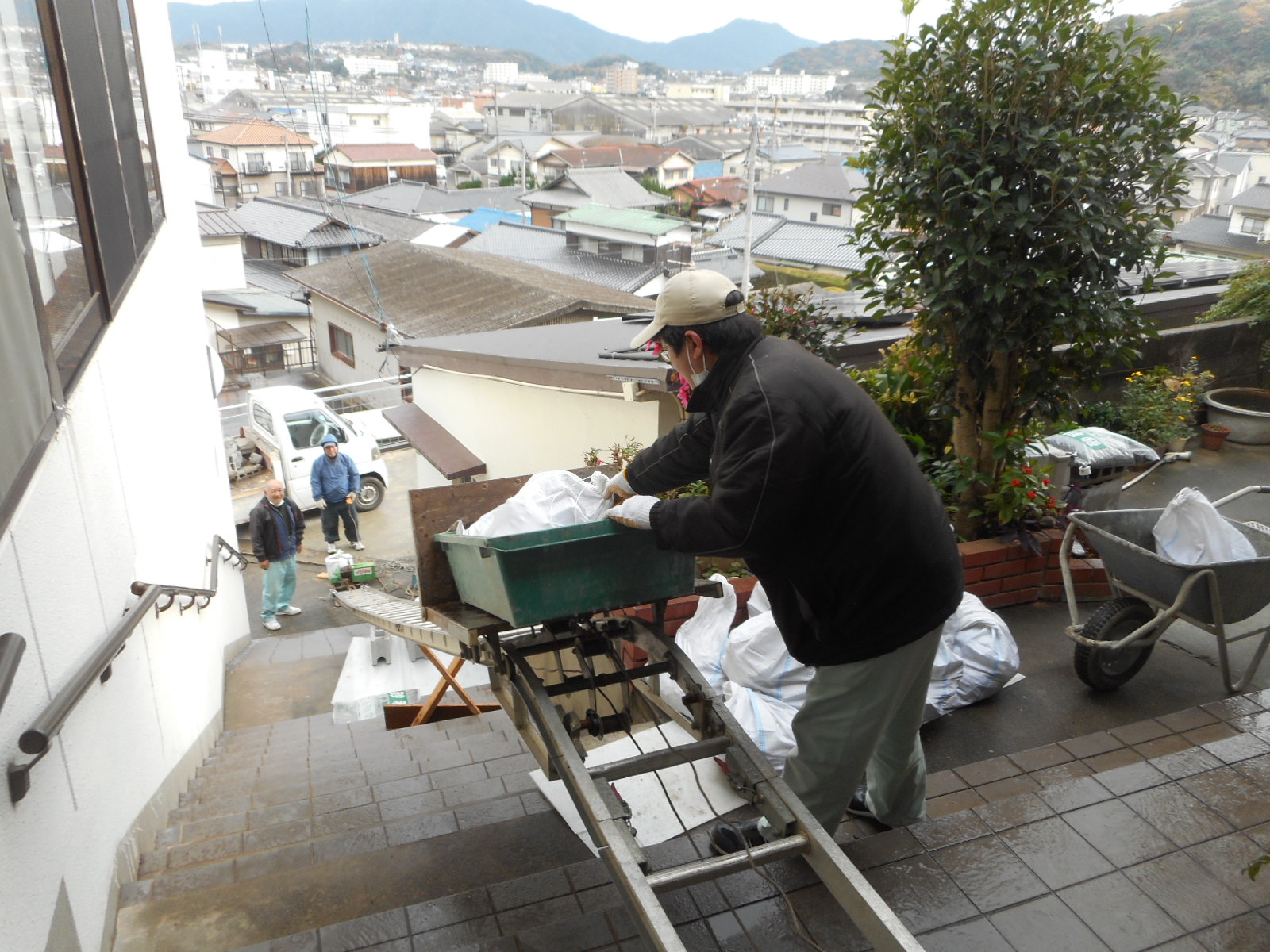 | 階段の下から上の玄関前までリフトを設置し ご覧の様に廃材を下に降ろします!! |