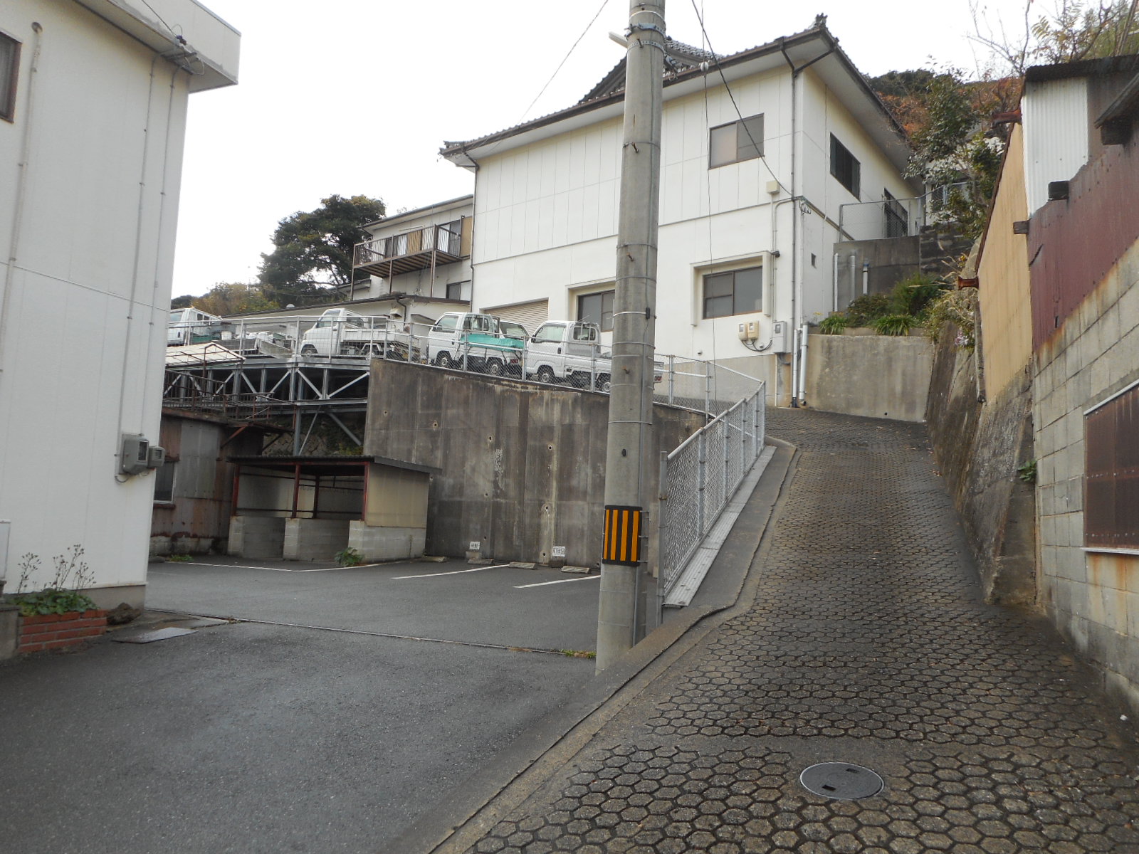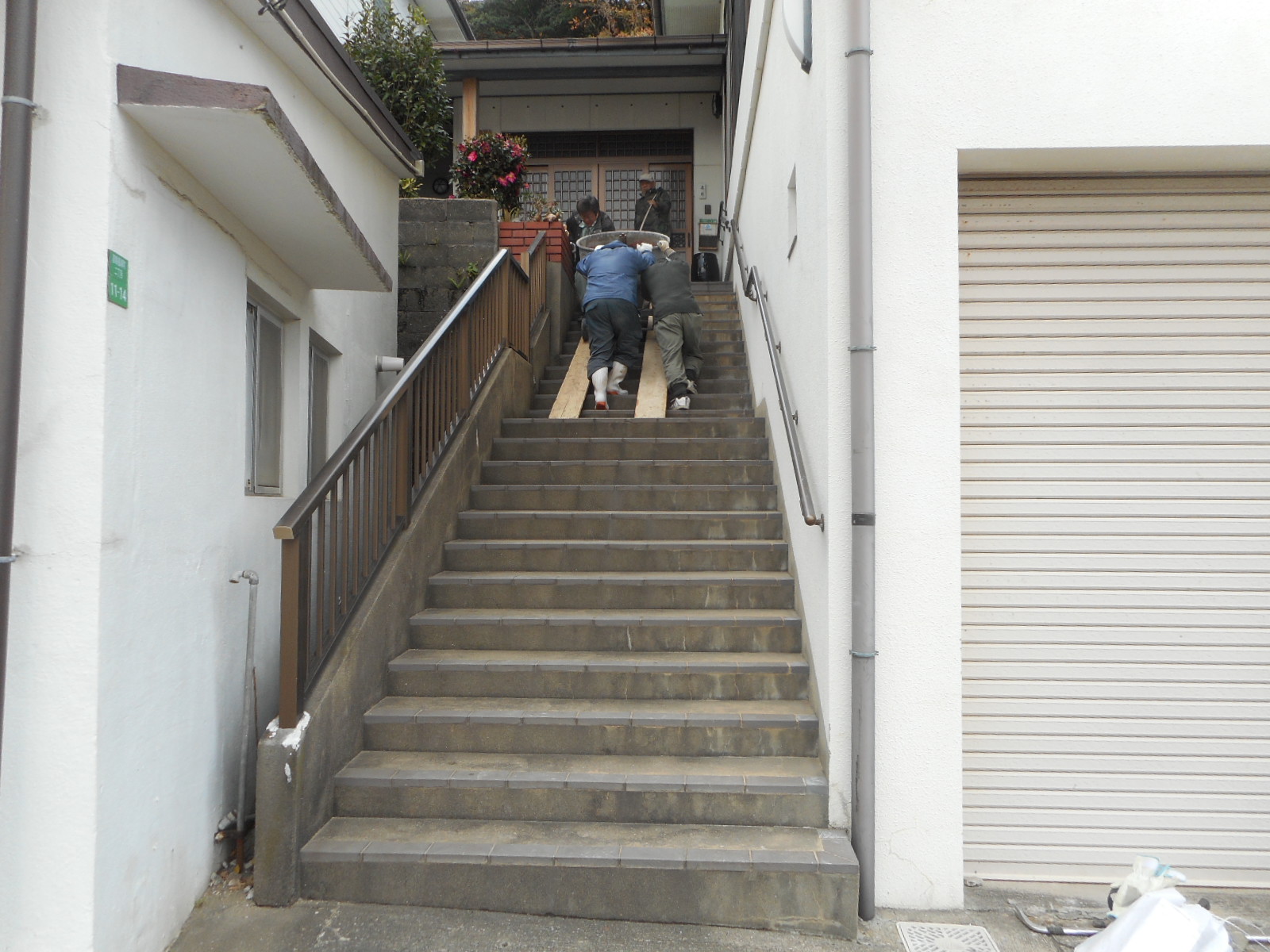 | 坂を登った上に建物が有ります!! | 階段の下まで車は入るのですが、ここから長い階段を上がり、さらに裏の現場まで家の廻りを50m位歩きます!! |