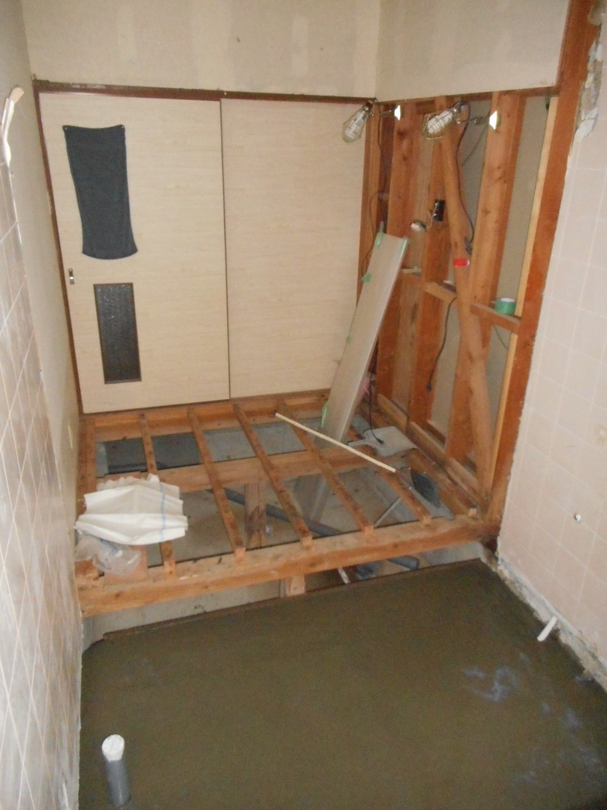 | 大工さんが脱衣所の床と、壁廻りの下地づくりをします!! | 脱衣所の床に、CF下地のコンパネを張ります!! |