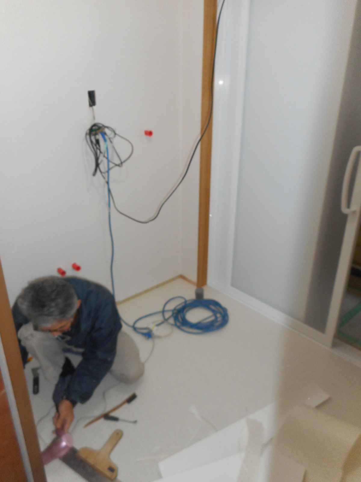 | クロス屋さんが、天井と壁廻りにクロスを張ります!! | 床にはCFを張ります!! |