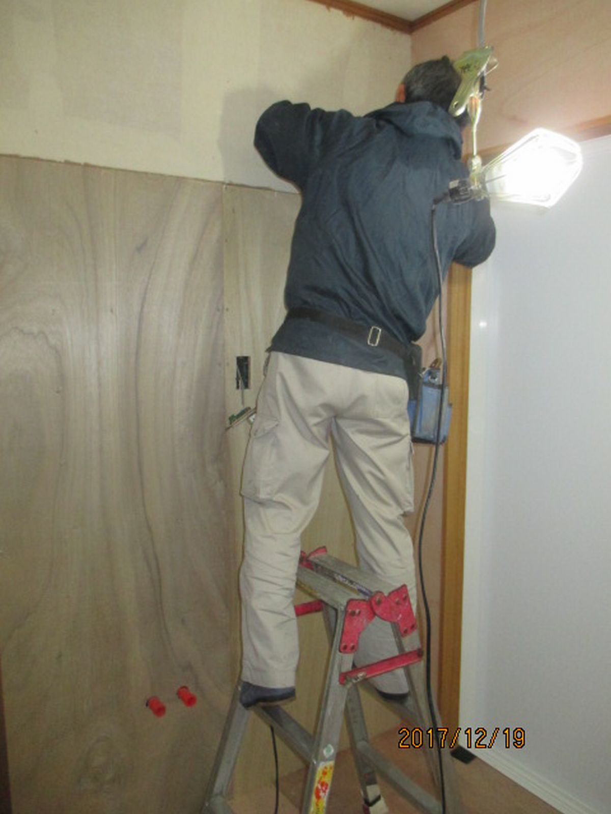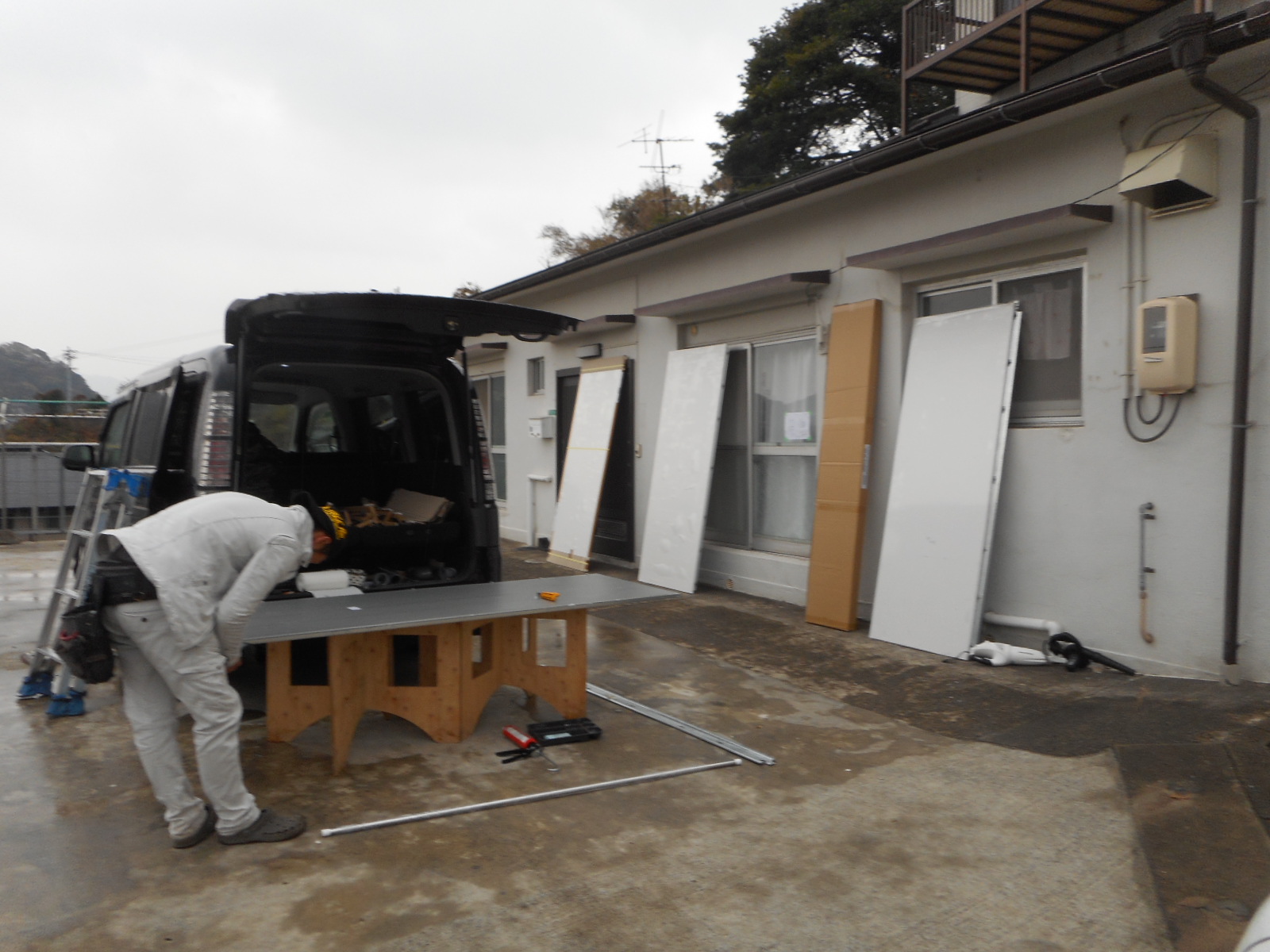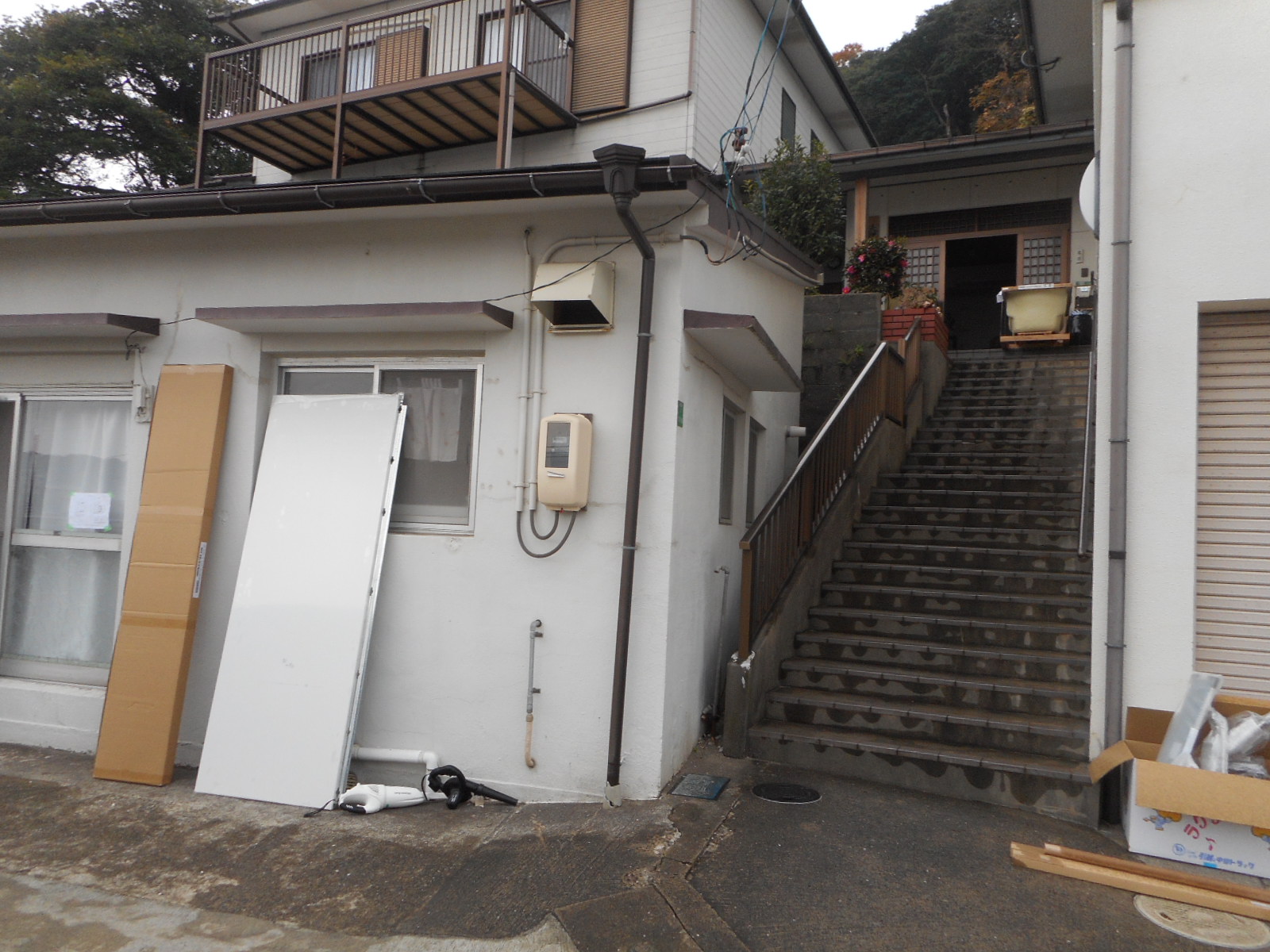 | 浴槽を階段の上まで、運び上げました!! | パネル等は下で加工して、上の現場まで運びます!! |