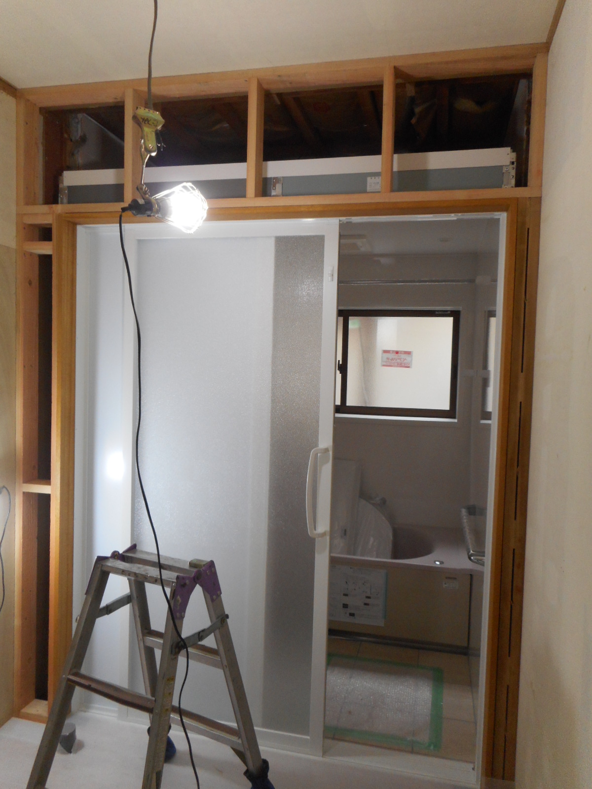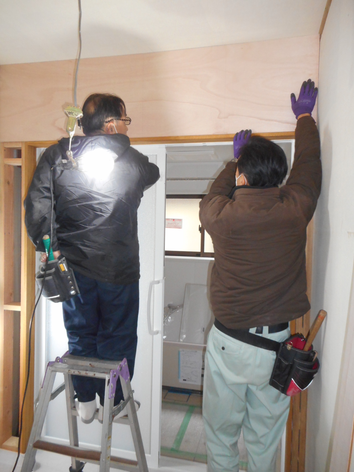 | 大工さんが、脱衣所側の壁の造作をします!! | クロス下地の、ベニヤを張ります!! |