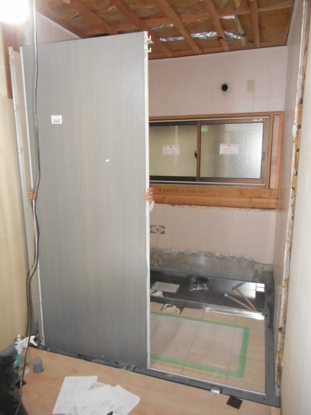 | 側面パネルを、順次組付けて行きます!! | 天井パネルを組付け、浴槽も据付けました!! |