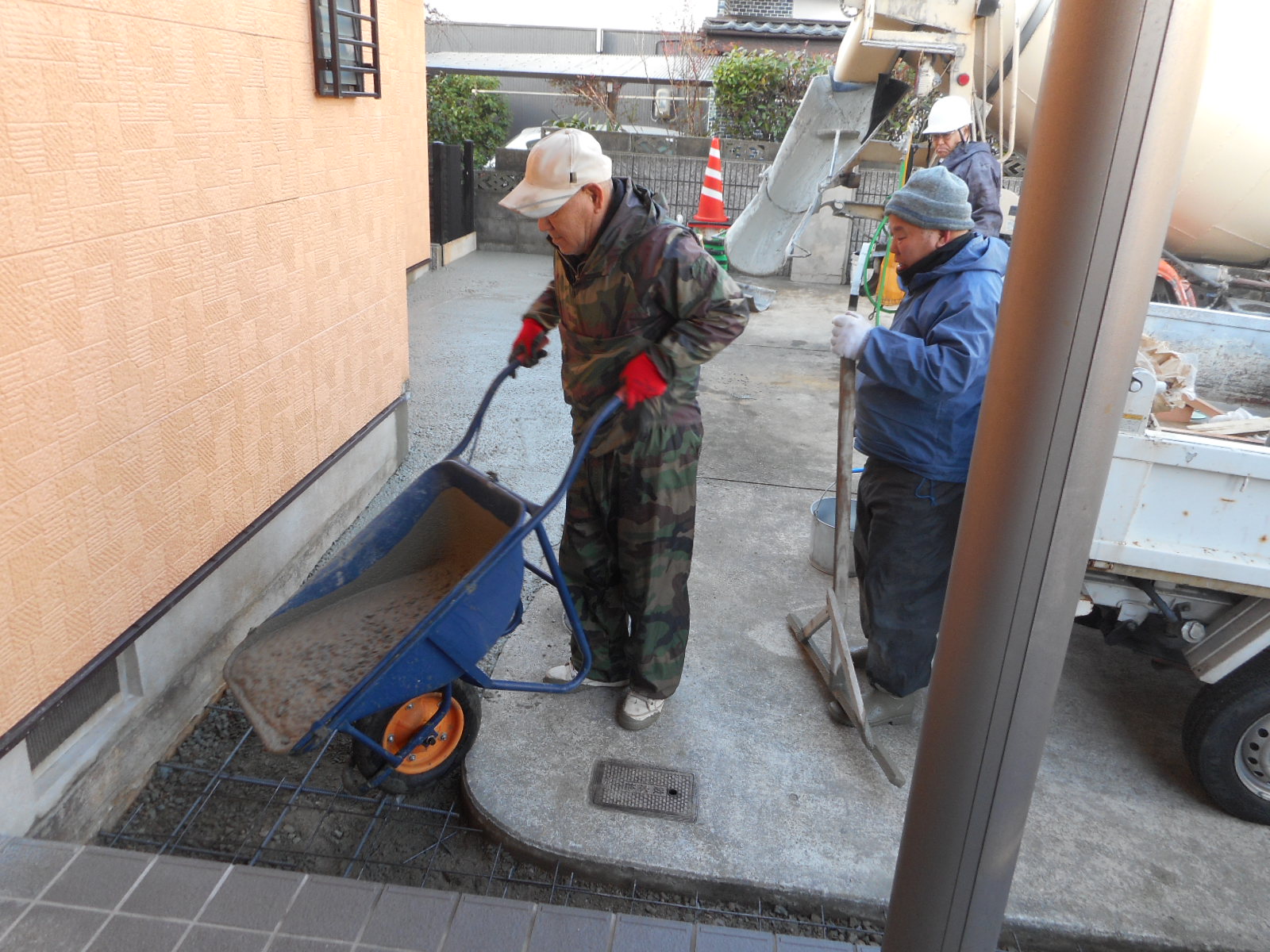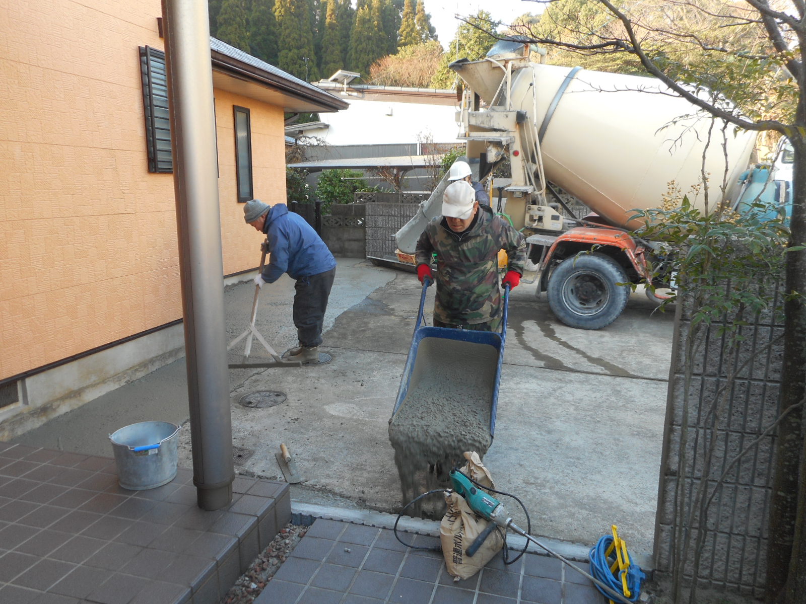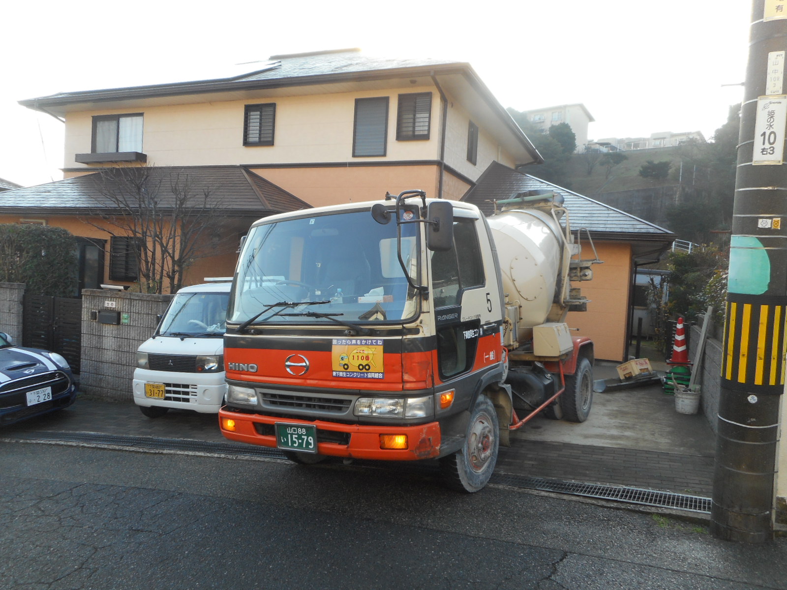 | 朝9時に、生コン車が到着しました!! | 生コンを打設して行きます!! |