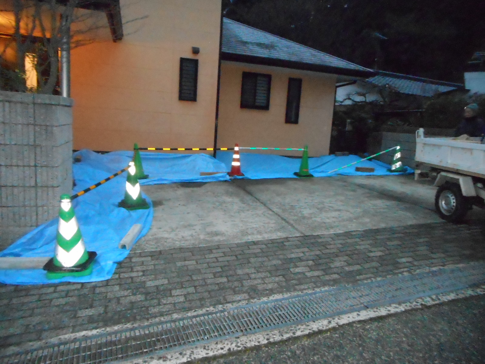 | この時期は生コンの乾くのが遅いため、夕方5時から仕上げの押さえをしました!! | 夕方6時ごろから雨が降る予報なので、すぐにご覧の様にシートで養生をしました!! |