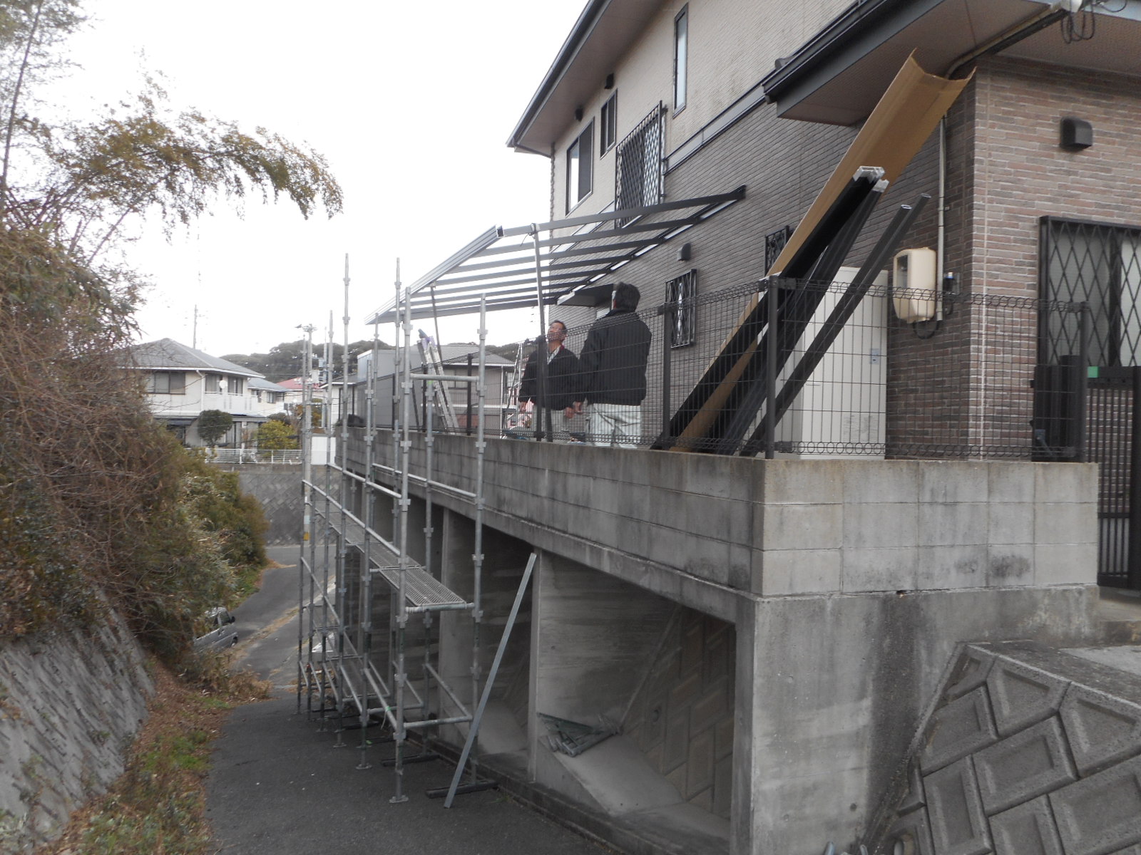 | ご覧の様な現場のため、外に足場を組んで作業をします!! | 屋根廻りの、骨組をしています!! |