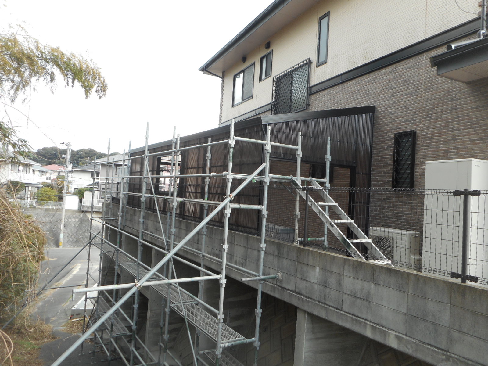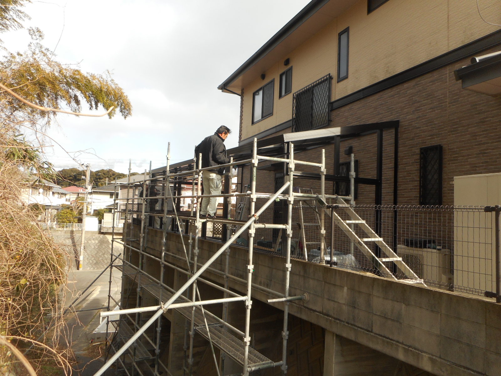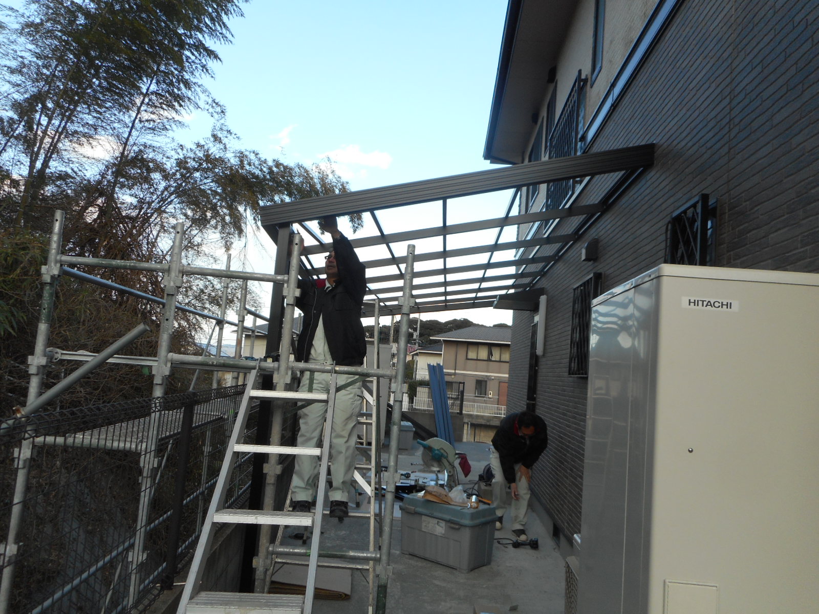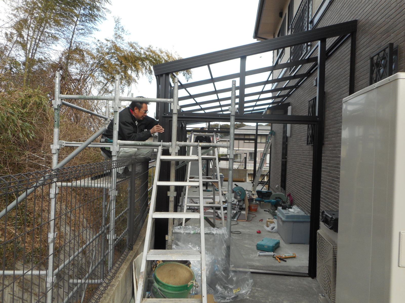 | 外から側面のモヤや、サッシ枠を取付けています!! | 外の足場の乗って、順次作業をしています!! |