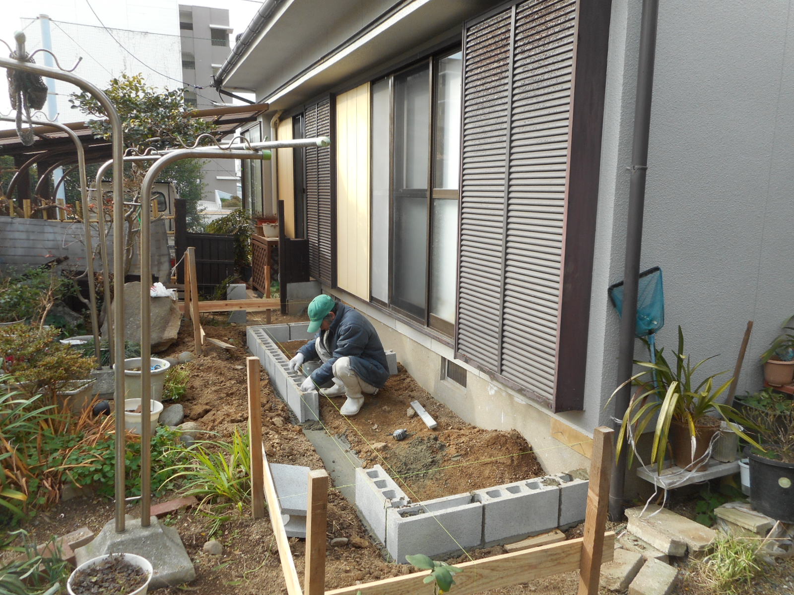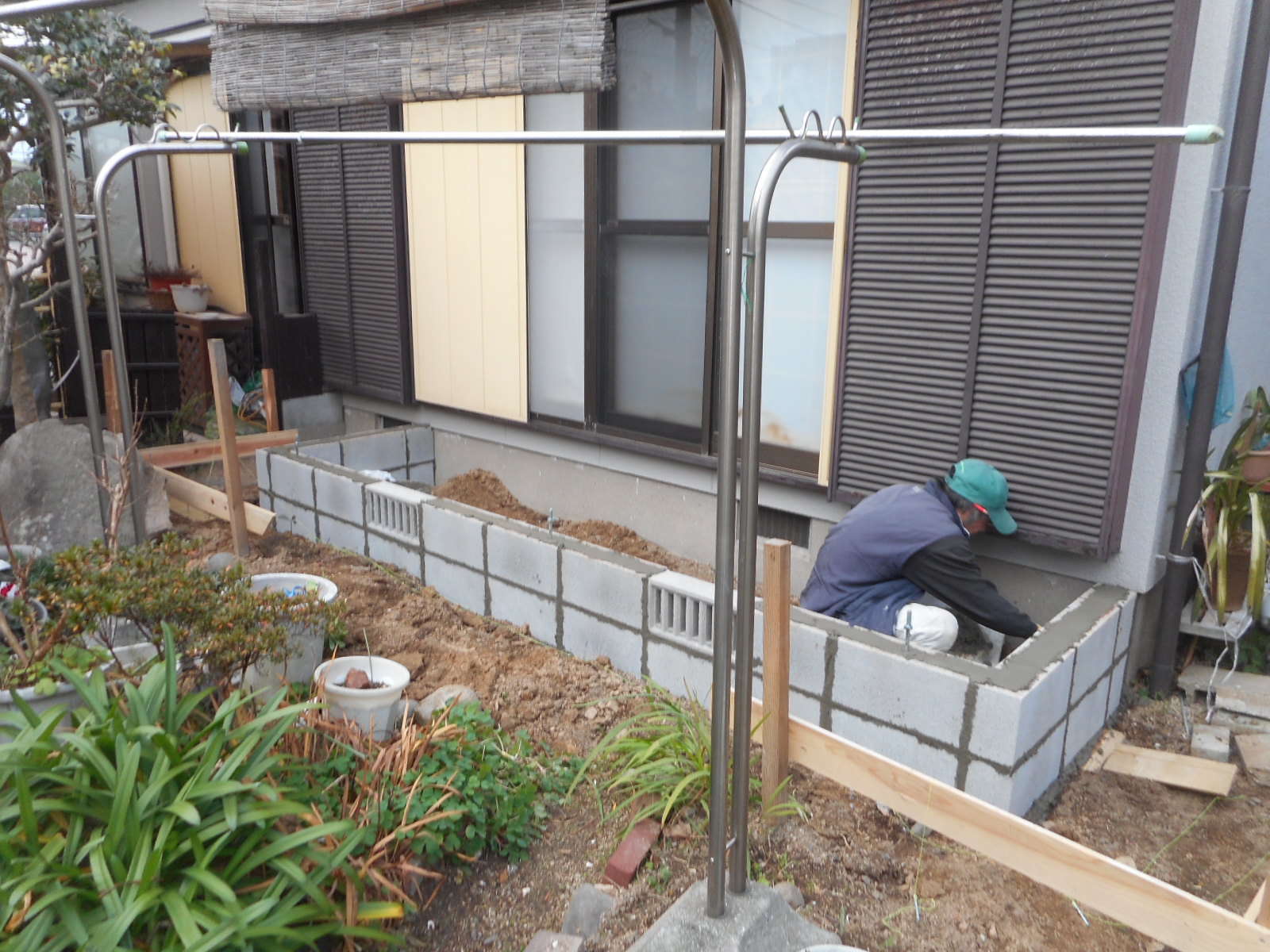 | 捨コンを打ち、ブロック基礎の1段目を付いています!! | 2段目を付いて、ブロック基礎完成です!! |