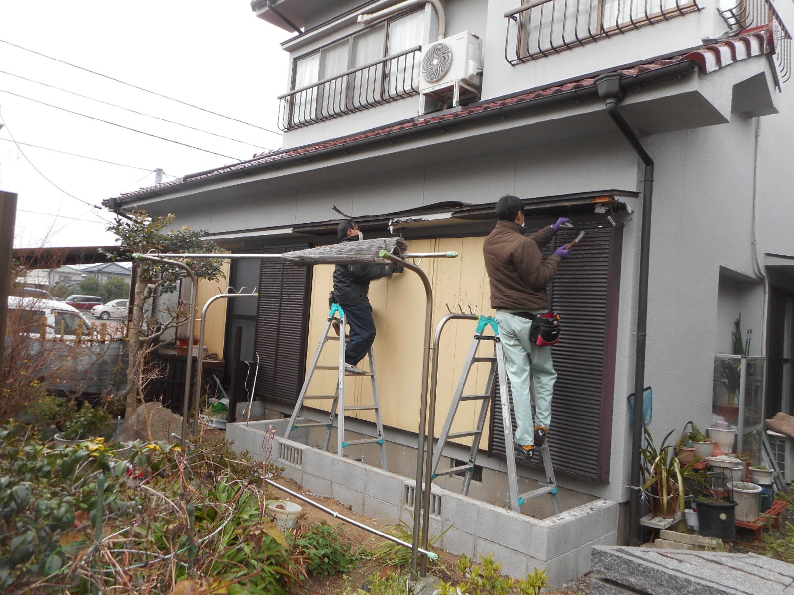 この期間は大変寒かったり、天候不順の日が多く中々思う様に作業が進みませんでしたが後は最後の仕上げ作業の塗装(破風板、鼻隠し、軒)を残してほぼ出来上がりましたので