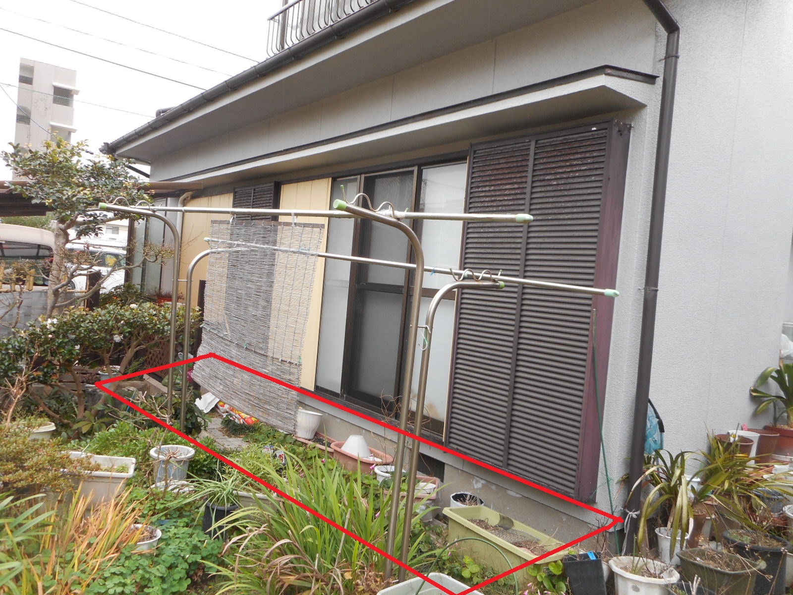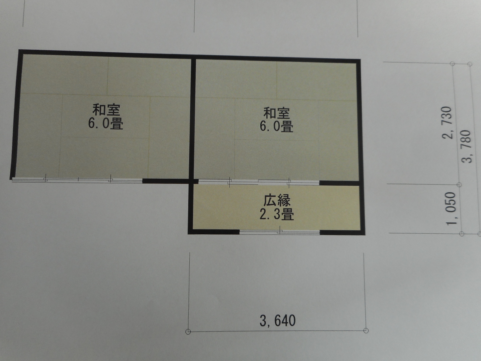 | 赤線□部分に、広縁を増築します!! | 図面のようなサイズの、広縁となります!! |