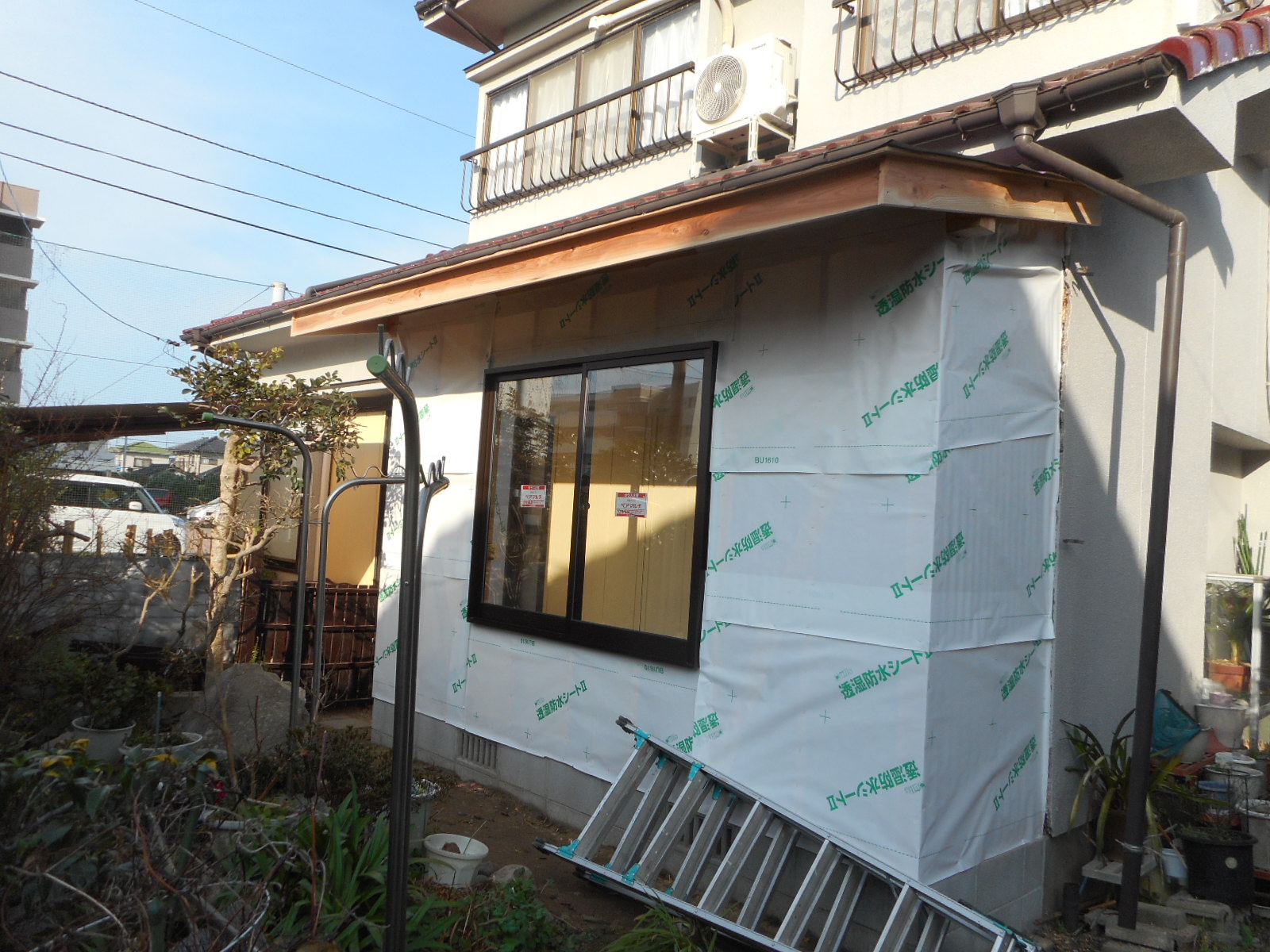 | 破風板、鼻隠しを施工し、屋根にコンパネを張り、ゴムアスルーフィングを施工しました!! | サッシ枠を取付け、壁廻りに透湿,,防水シートを張ります!! |