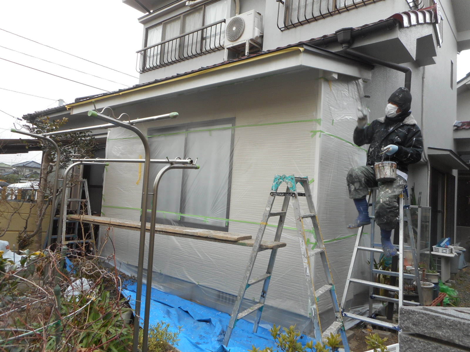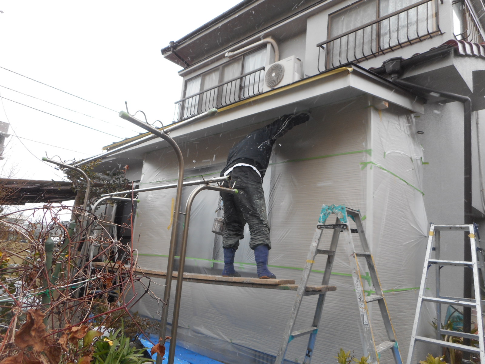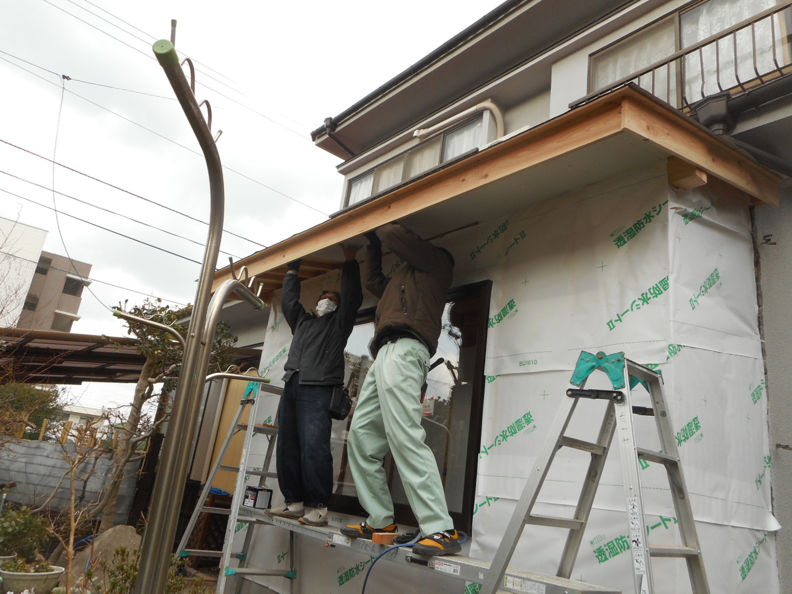 | 軒天を塗装しています!! | 破風板や鼻隠しも、塗装します!! |