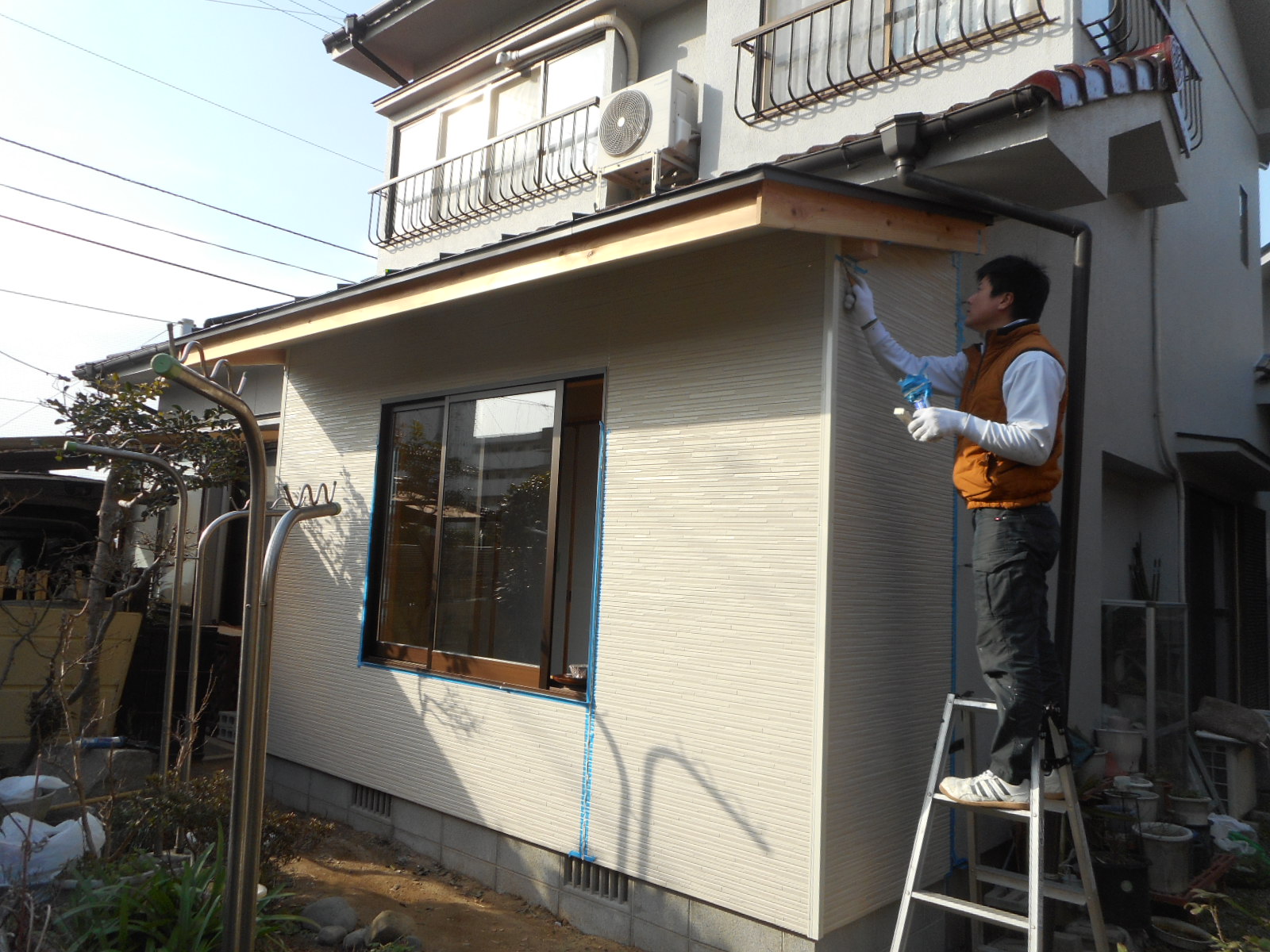 | サッシ廻りやサイデング目地に、コーキングを打ちます!! | 母屋周りにも、コーキングを打ちます!! |