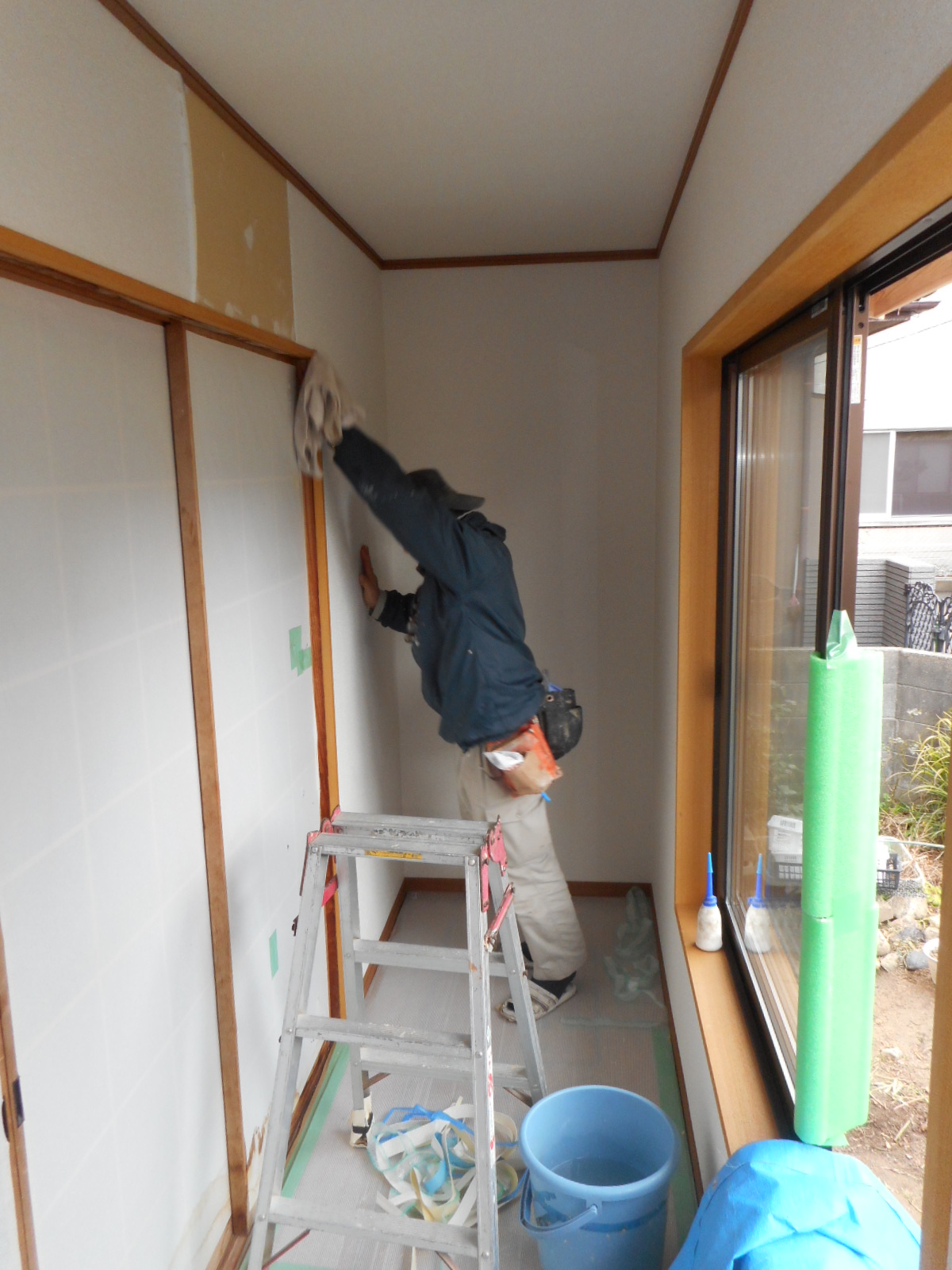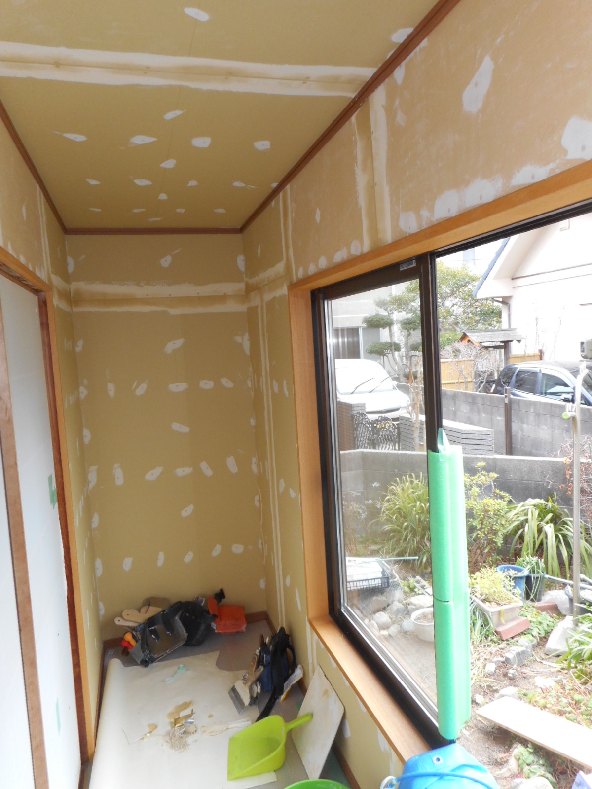 | 床のフローリングも張り終え養生をし、クロスを張る前にパテ処理をしました!! | 天井と壁廻りに、クロスを張ります!! |