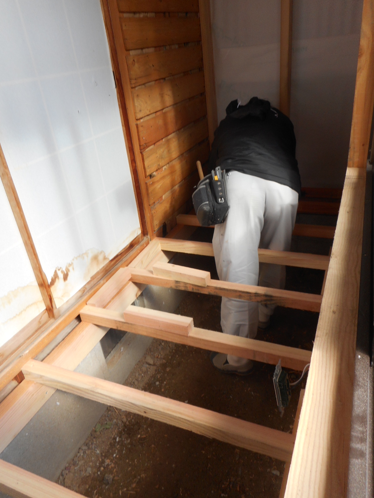 | 根太タル木を、施工します!! | 床には捨て張りコンパネを施工し、天井と壁廻りは断熱材を入れ、クロス下地のボードを施工します!! |