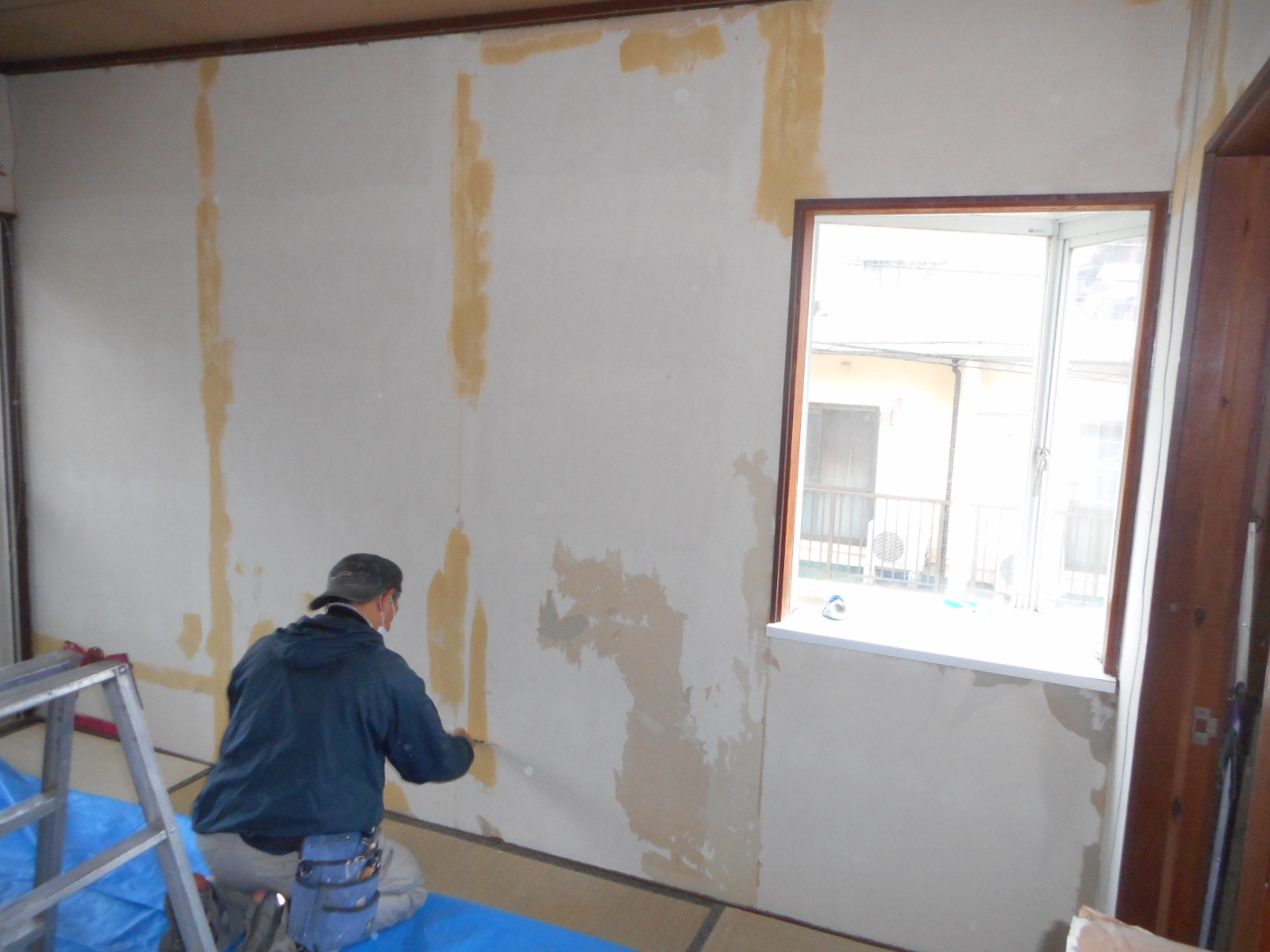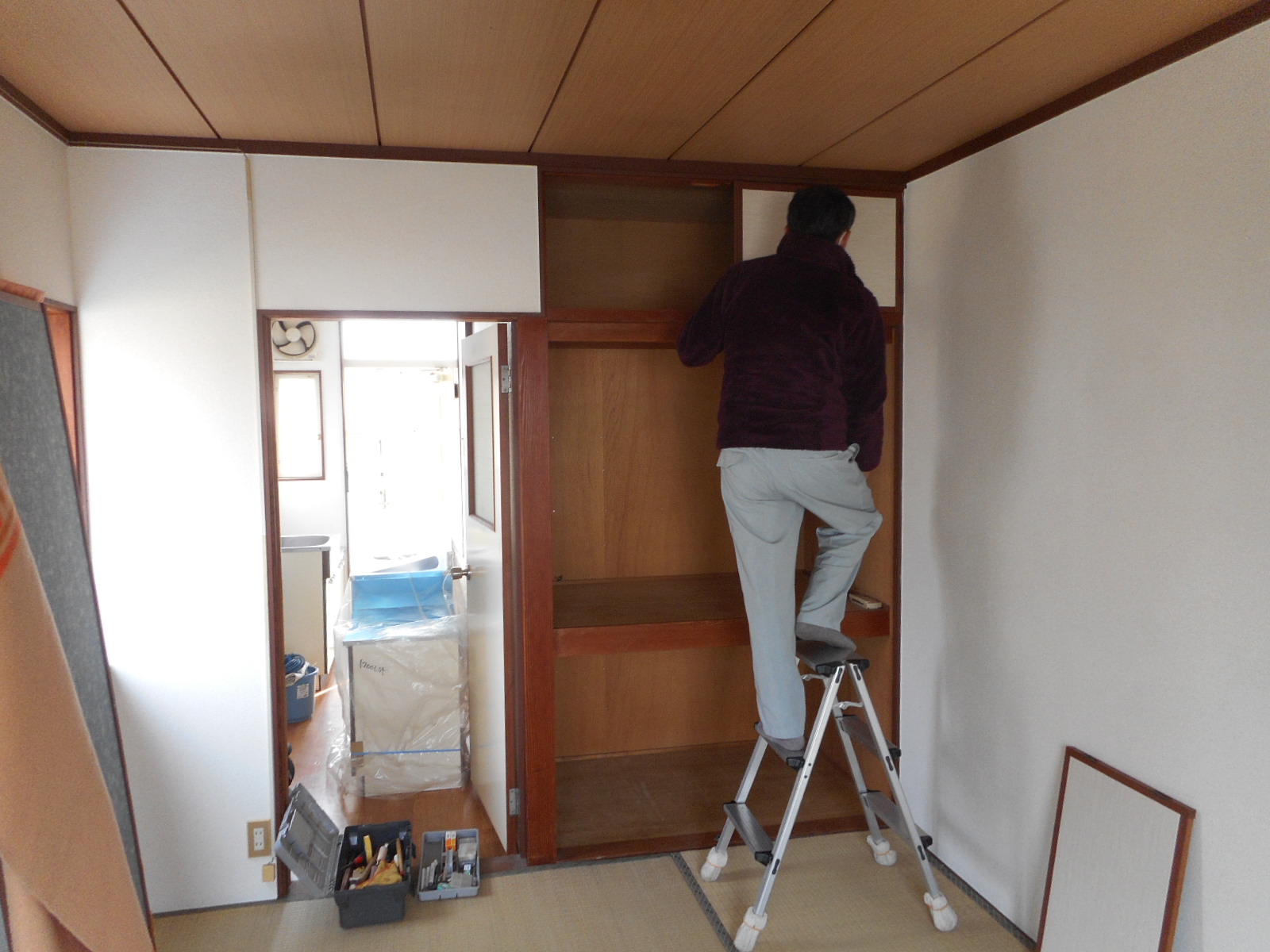 既存のクロスを剥ぎ、下地処理をしています!! クロス張りの完了後、張替えた襖を収めています!!