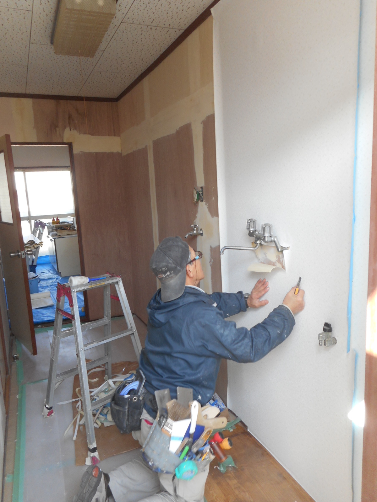 既存のクロスは剥ぎ取り、ベニヤを施工します!! 新規のクロスを張っています!!
