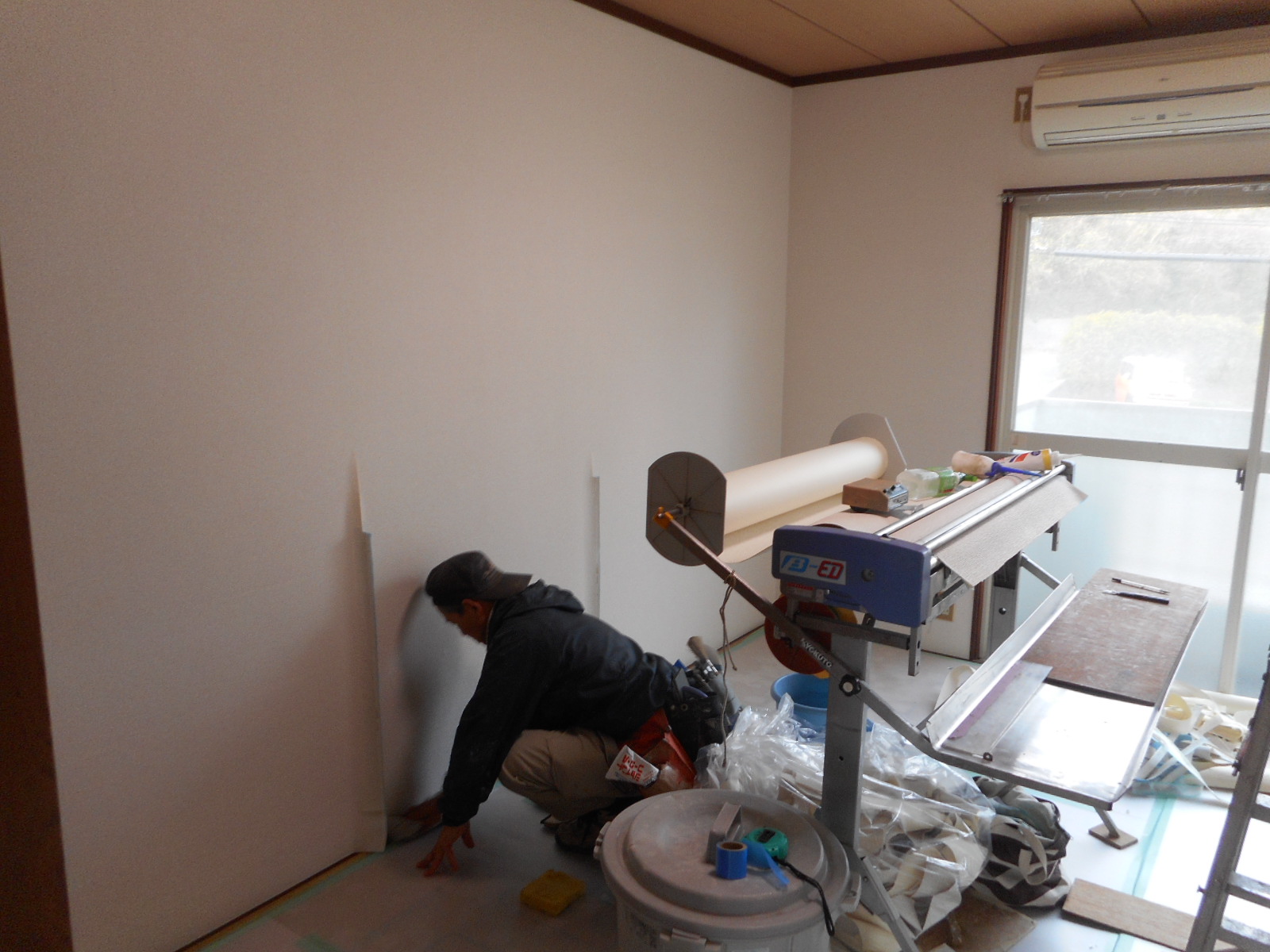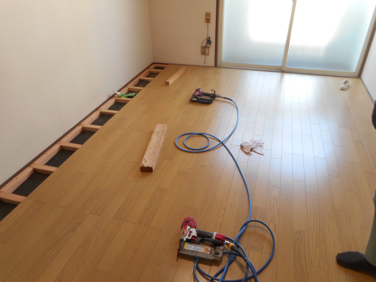 畳を撤去後、下地づくりをし、フロア材を施工しています! 壁廻りのクロスを、張っています!!