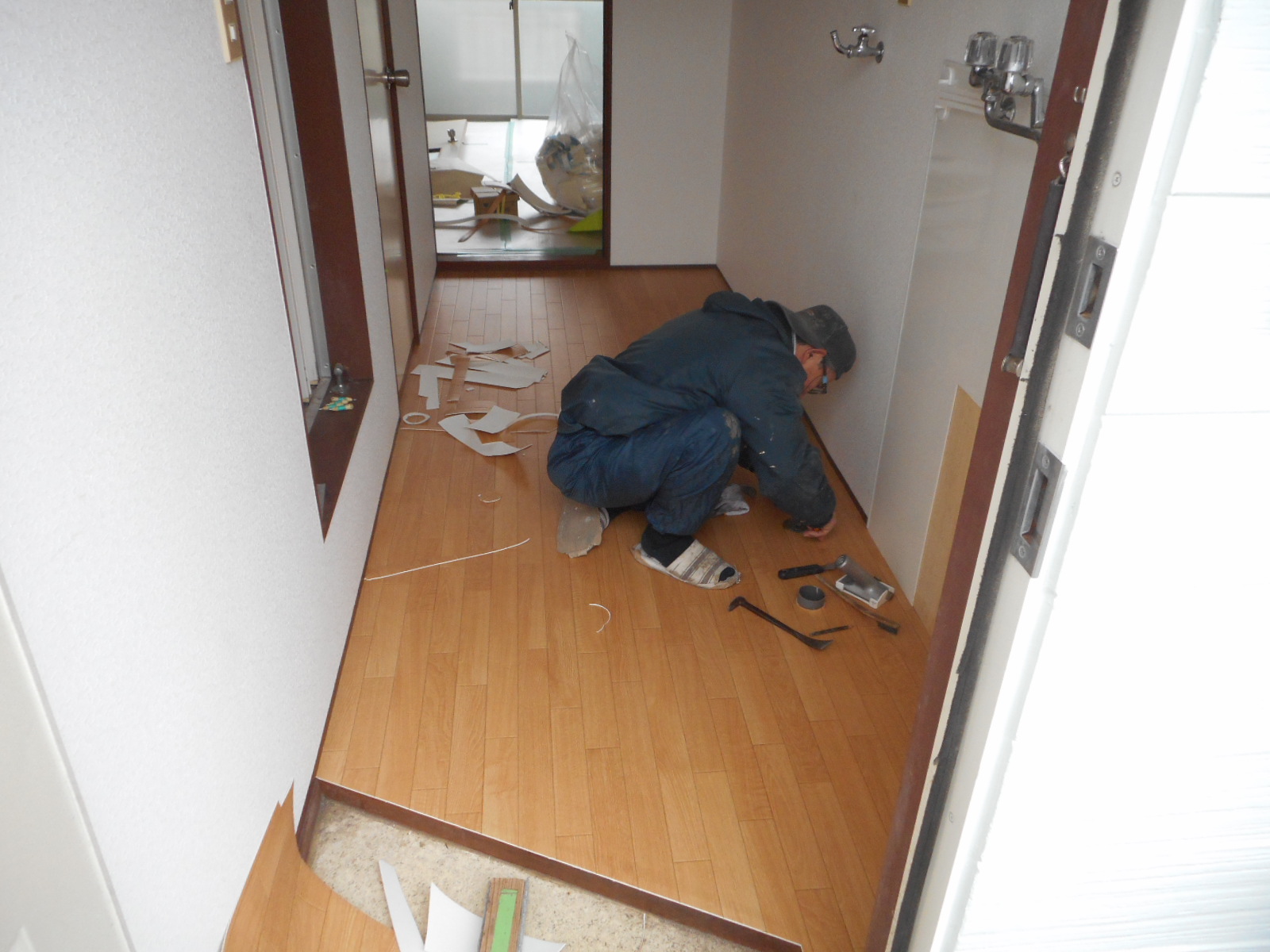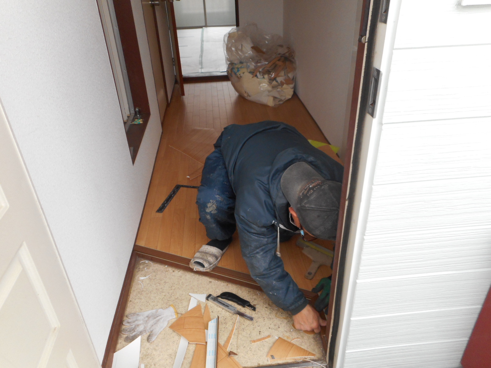 流し台を撤去後、床の下地処理をし、新規のCFを施工しています!! 上がり口に、見切りのスベリ止めを施工します!!