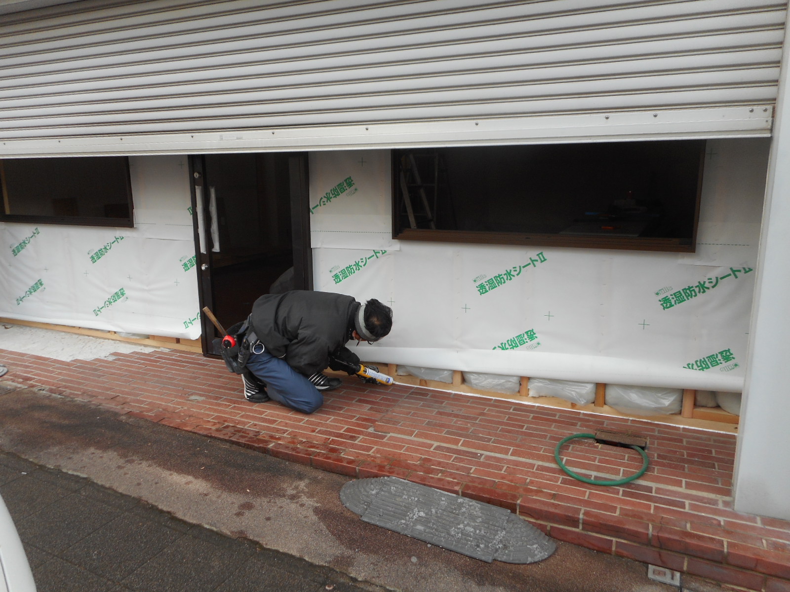 木下地の下部に、雨水の浸入を防ぐための用心にコーキングを打ちます!! 下部にモルタル巾木の下地合板を施工し、透湿,防水シートを施工します!!