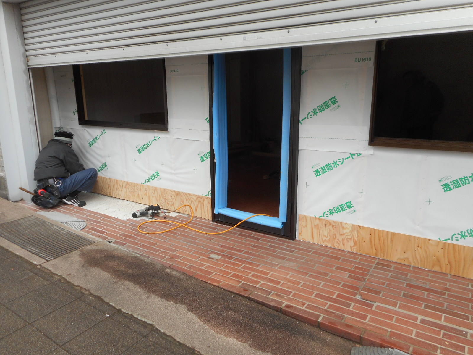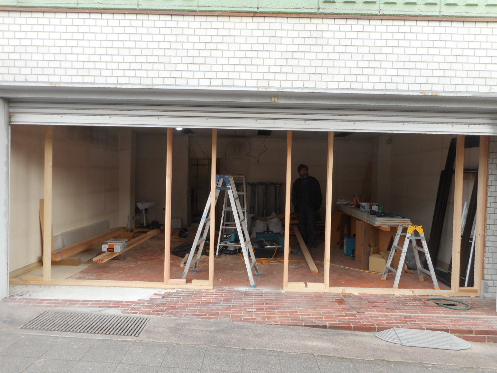 間柱で、壁の骨組みをします!!(外から見る) 順次壁の造作をします!!(室内から見る<寒いのでシャッターを半分下して作業をしています>)