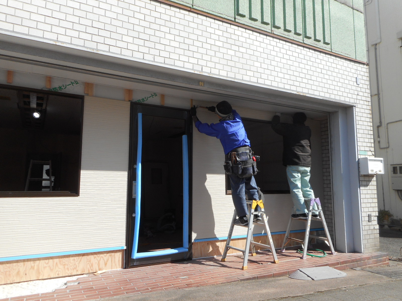 下地胴ブチを施工し、サイディングを張って行きます!! 2人で、順次サイディングを張って行きます!!