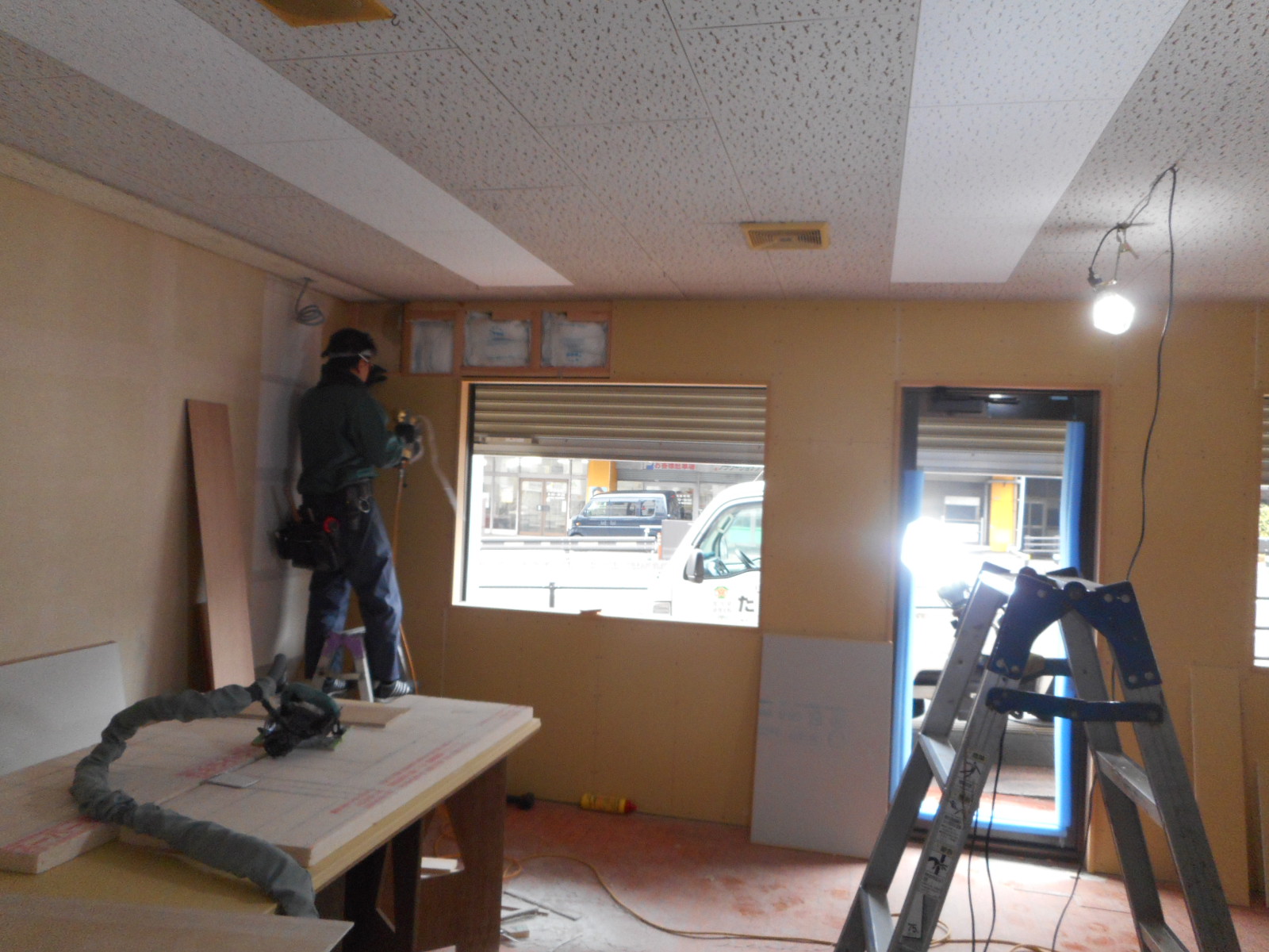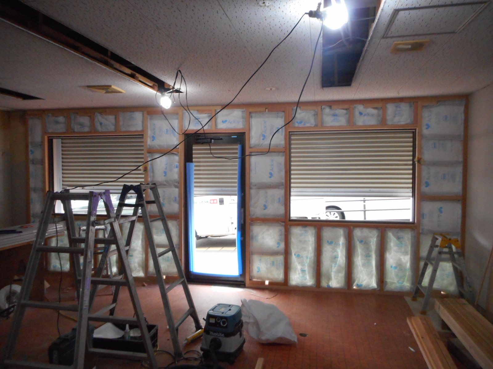 ドアとサッシの枠を取付け、壁の中に断熱材(グラスウール)を入れました!! 壁廻りにクロス下地の、プラスターボードを施工します!!