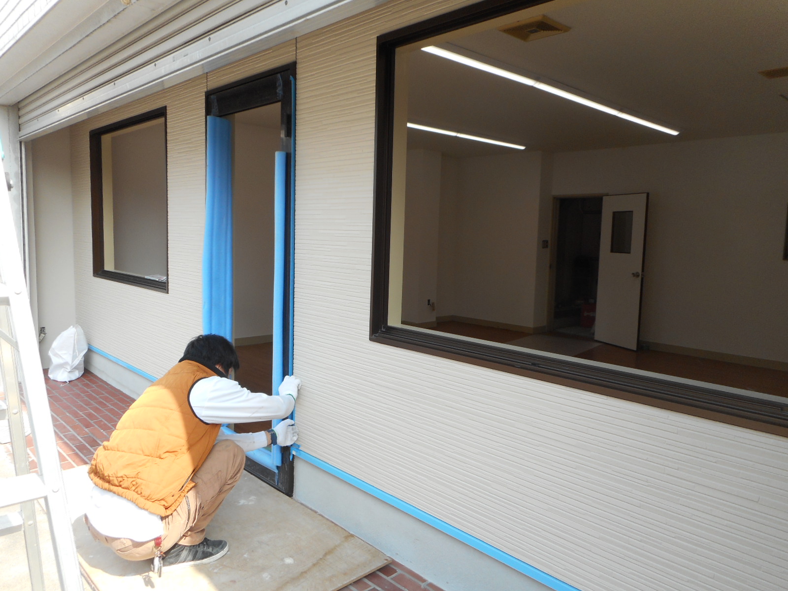 ドア廻りに、コーキングを打つ前に養生テープを張ります!! サッシ廻りやサイディング目地にも養生テープを張り、コーキングを打ちます!!