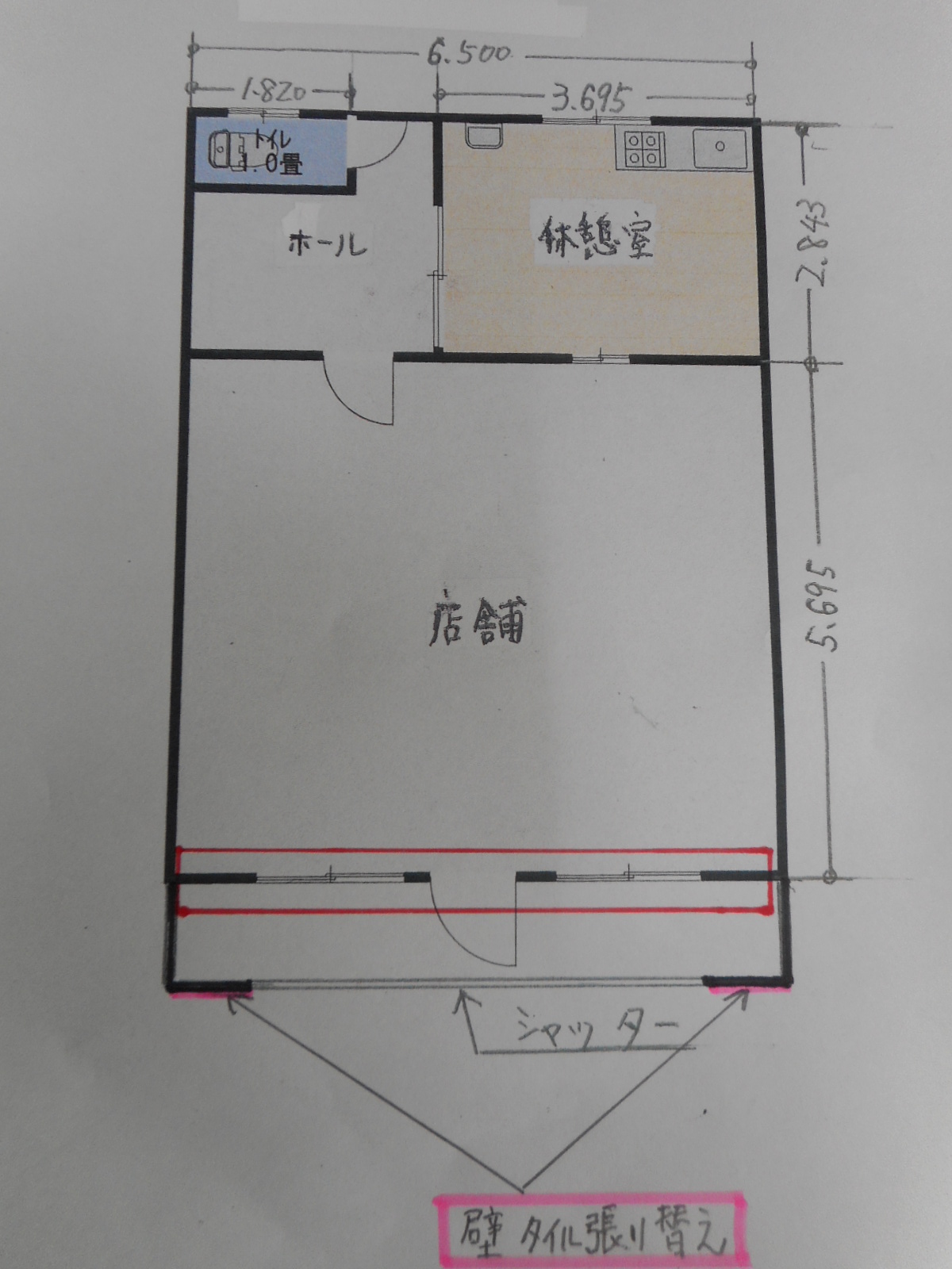 赤線で囲った部分に新規に壁を造り、入り口ドアとサッシを取付ける造作工事をします。