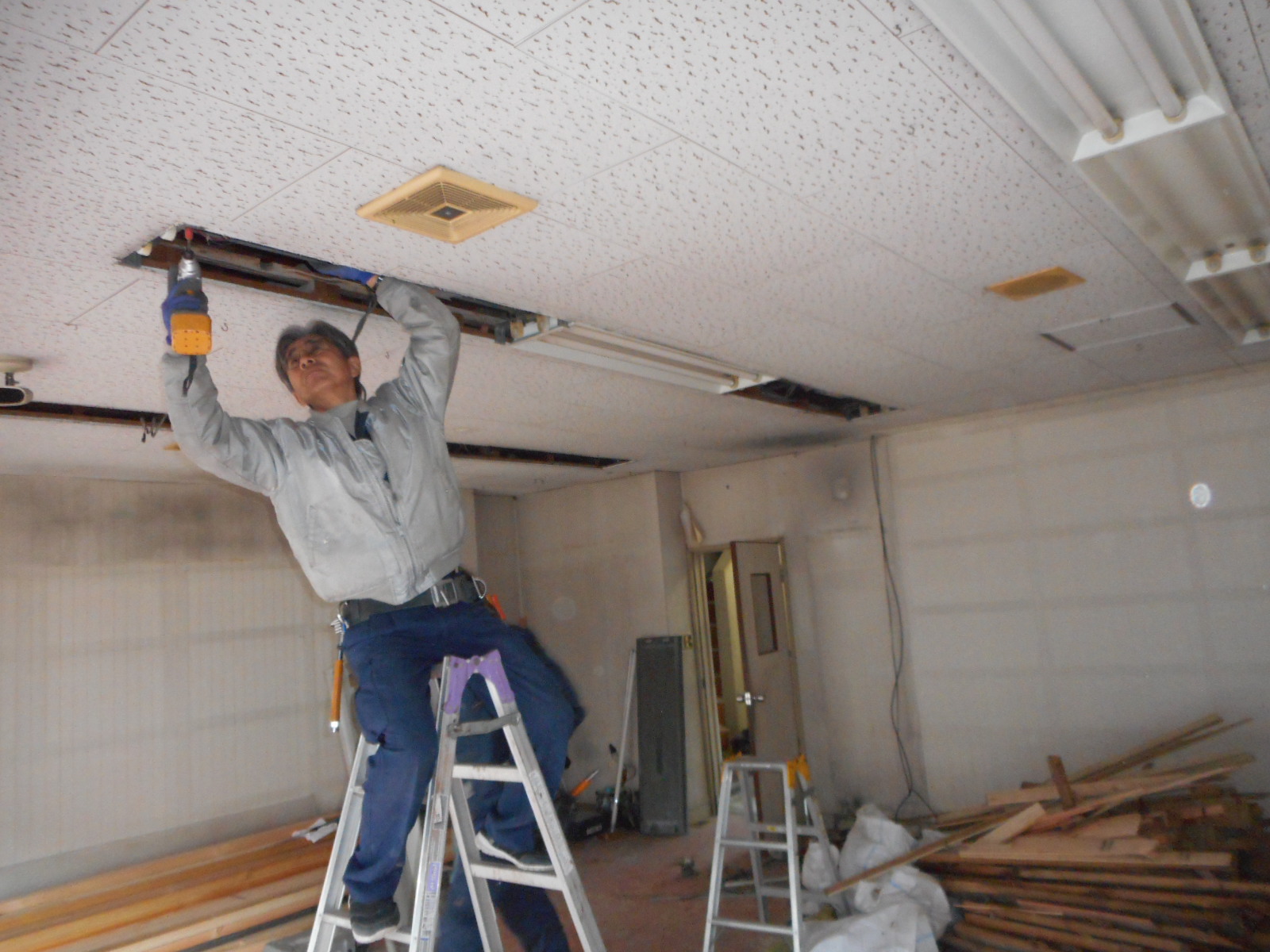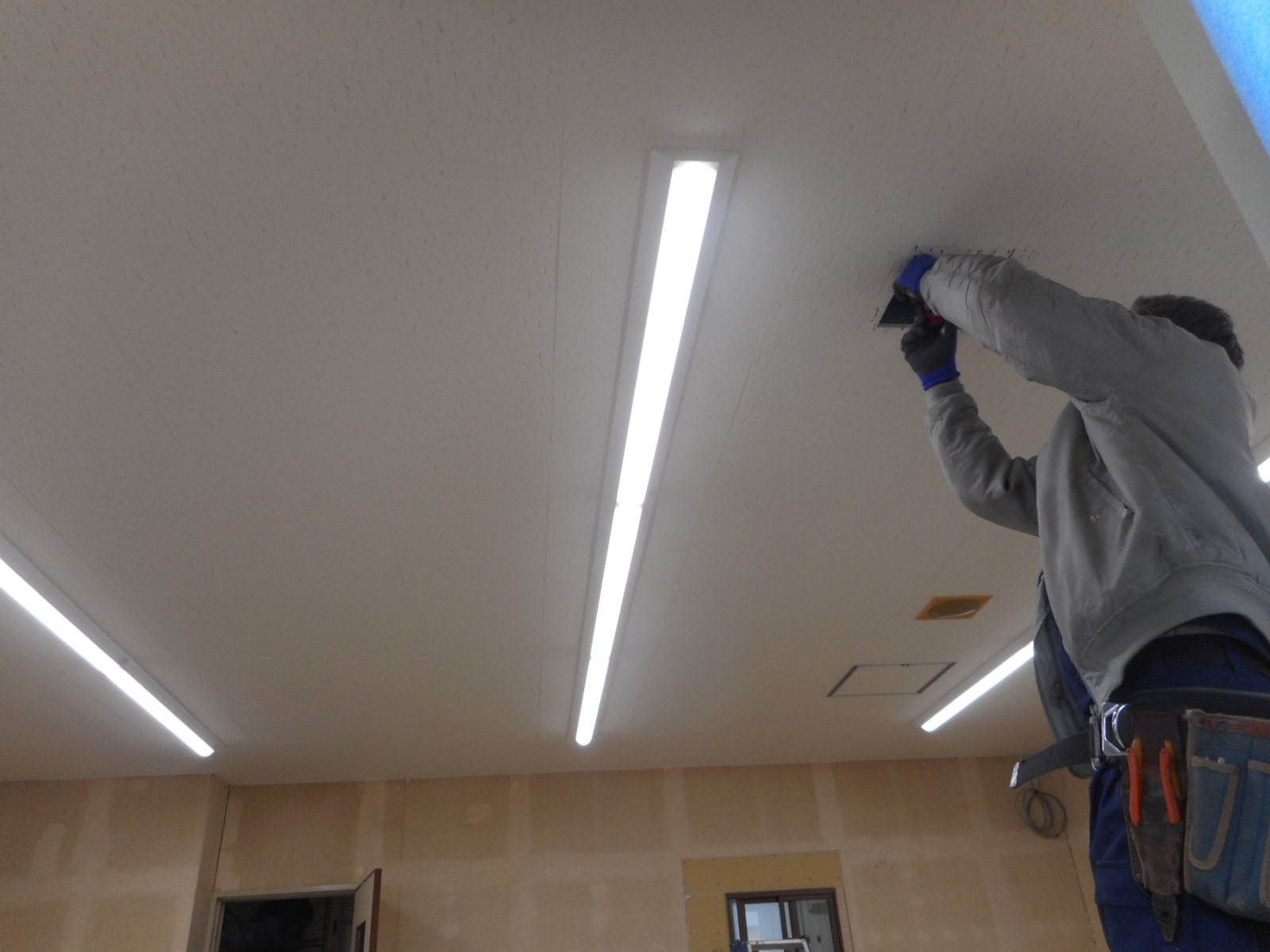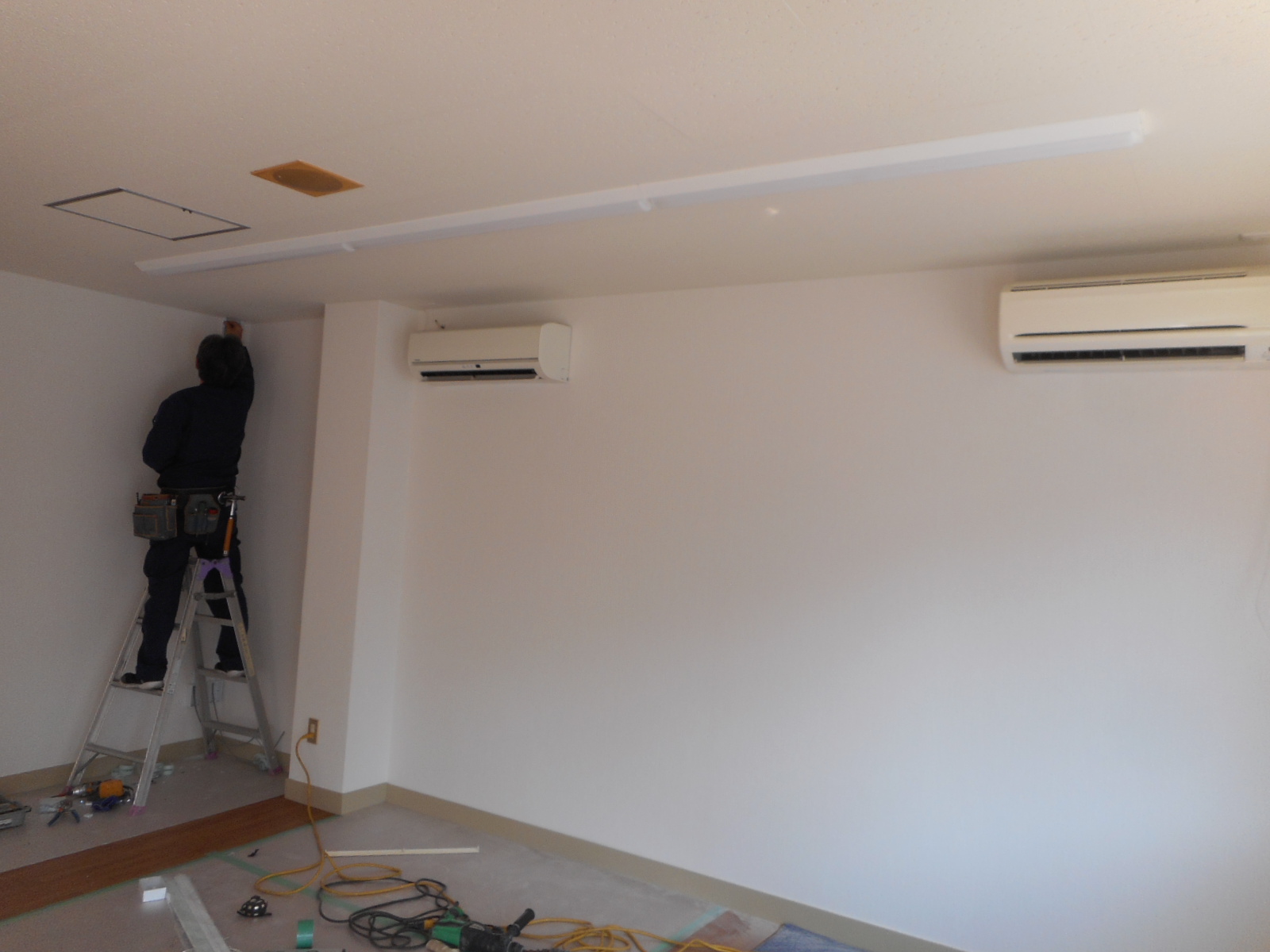 | 天井の塗装をしています!! | 塗装がおわったら、新規にLEDの照明器具を取付けます!! |