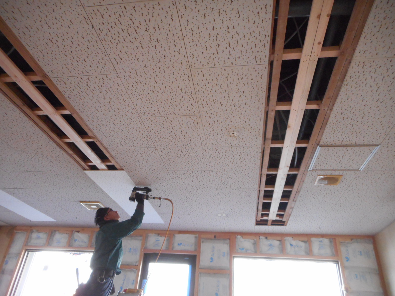| 下地づくり後、新規の天井材(ジプスター)を施工して行きます!! | 天井材の施工が完了しました!!(天井は後で塗装します) |