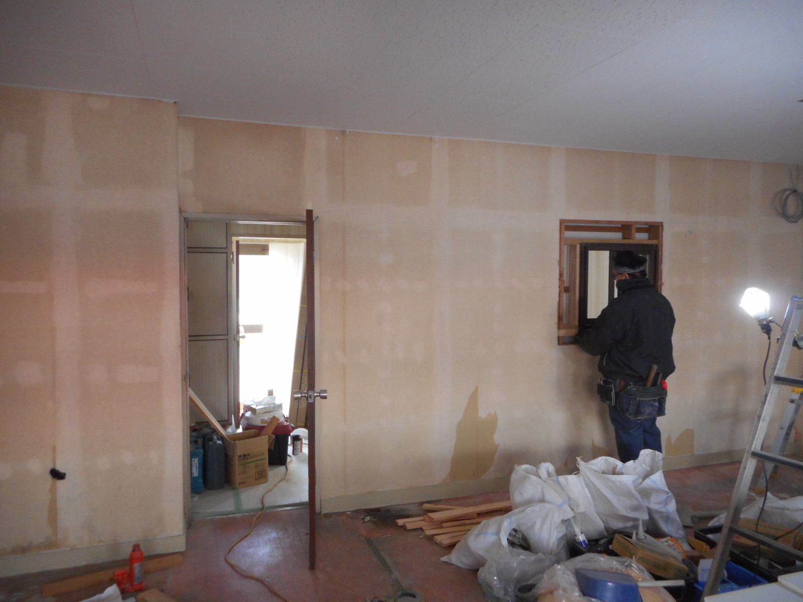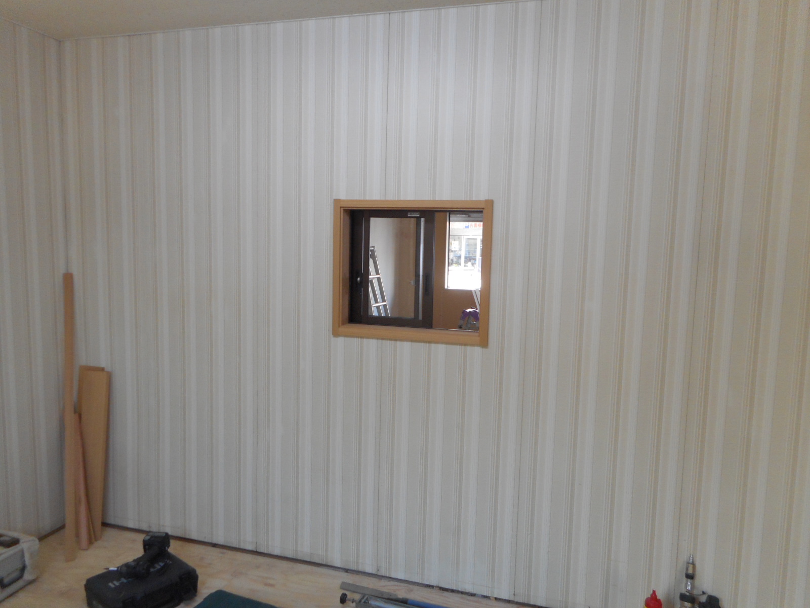 | 店舗と休憩室との間の壁を開口し、小窓を取付けます!! | 小窓の取付けの完成を、休憩室側から見る!! |