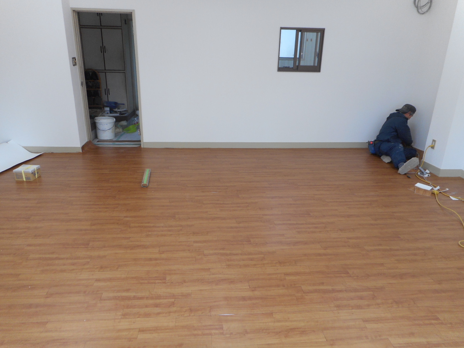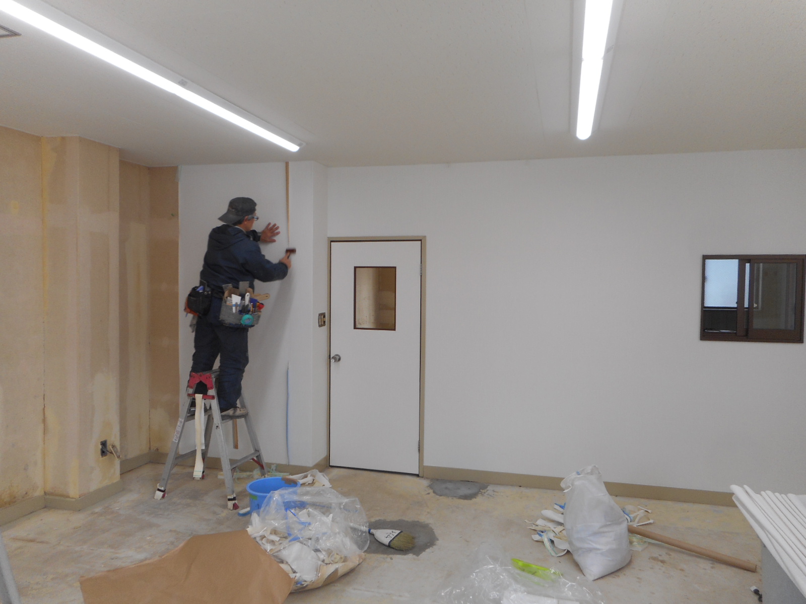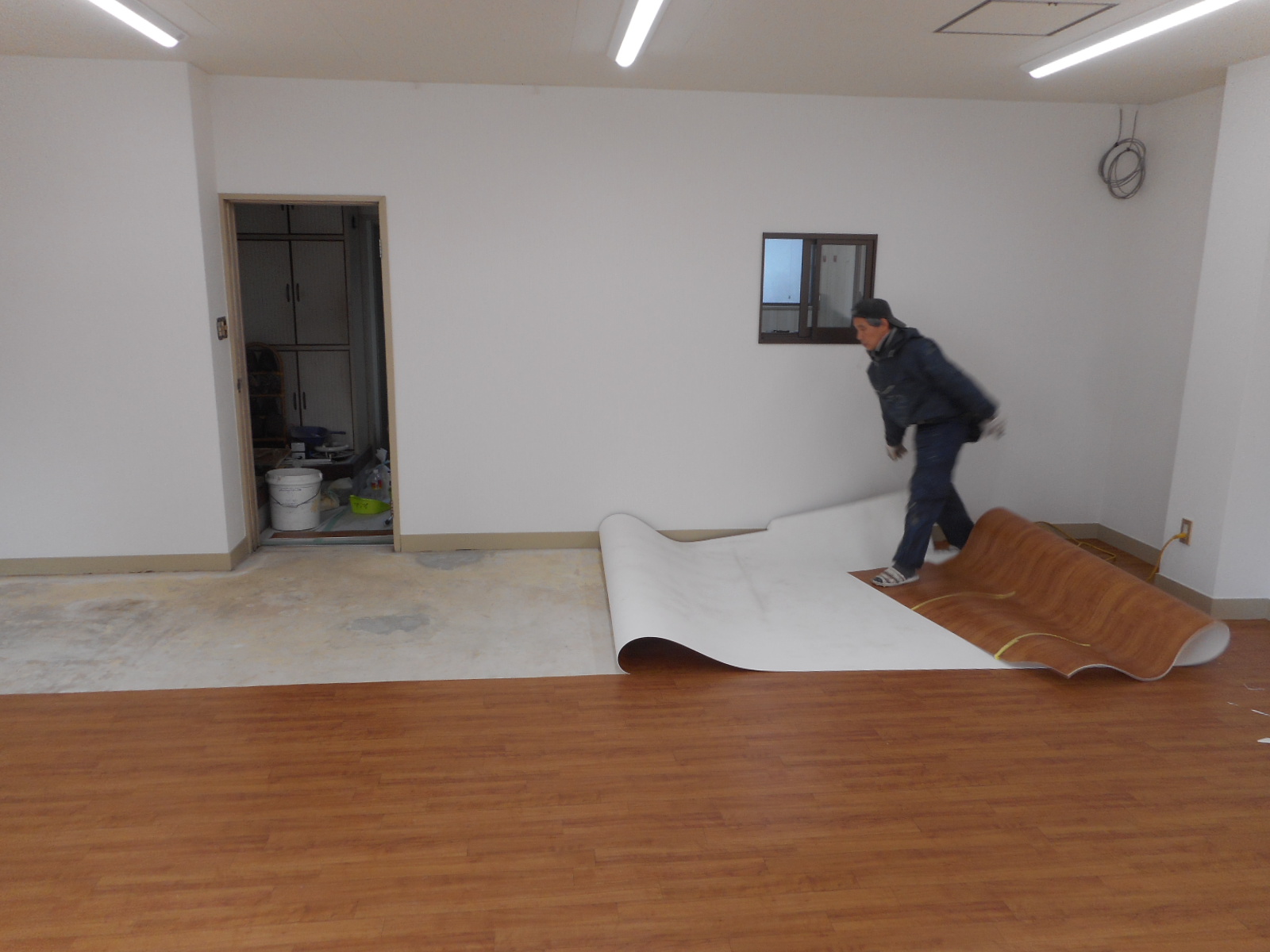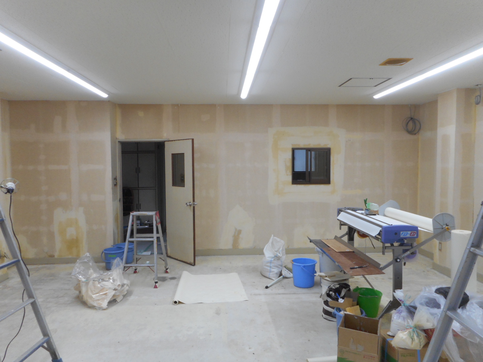 | 床のCFを撤去し、壁のクロスを張る前の下地処理を処理をしました!! | 壁廻りにクロスを、張って行きます!! |