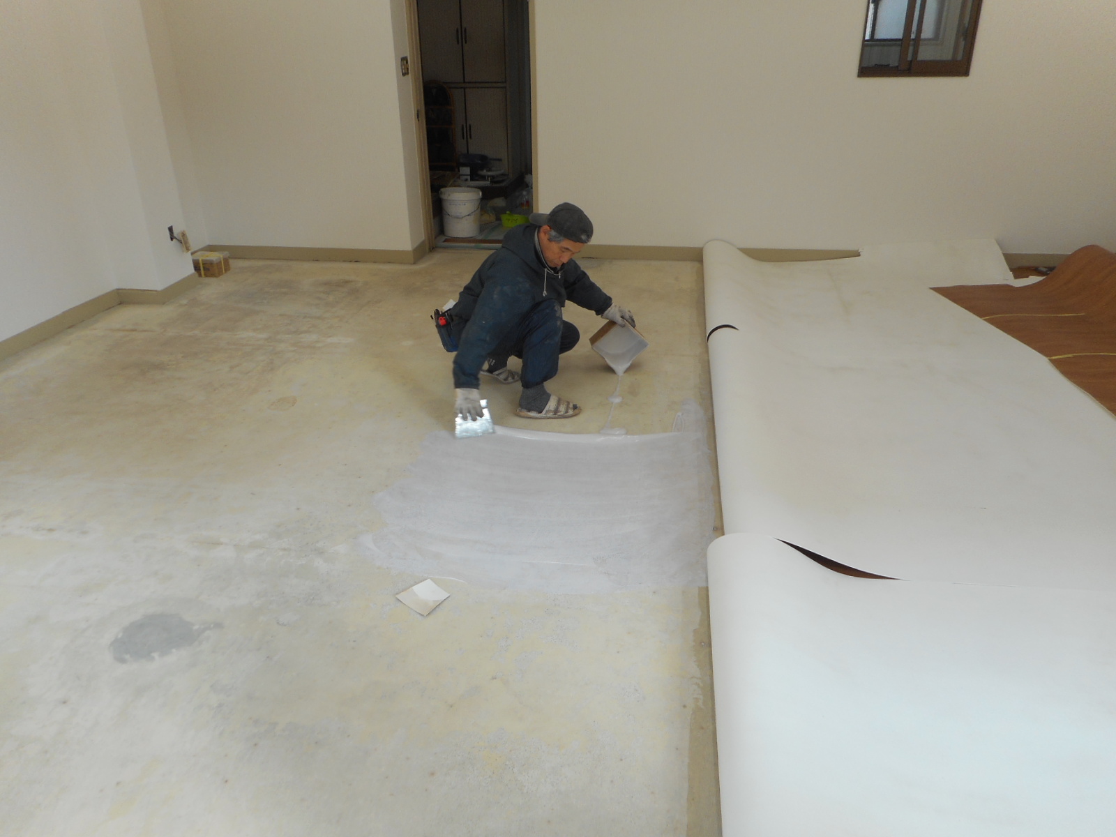 | 床に接着ボンドを、塗布して行きます!! | 順次CFを、張って行きます!! |