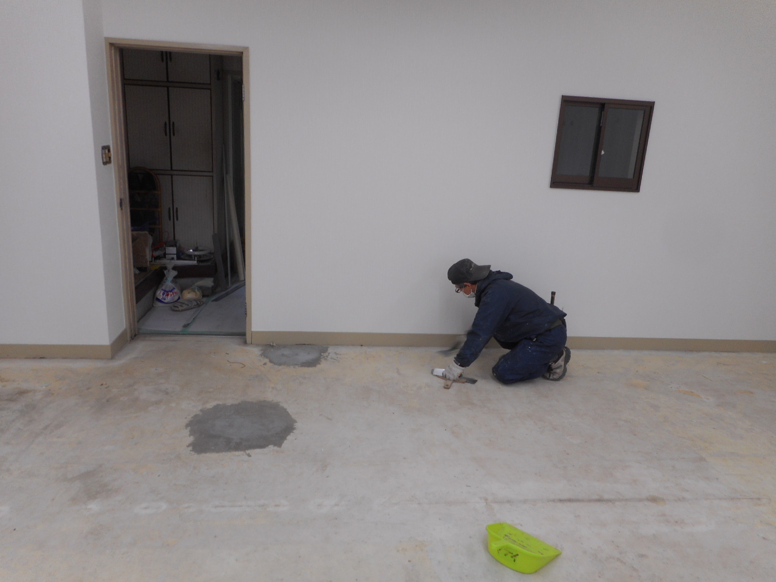 | 床に新規のCFを張る前に、下地整備をします!! | 新規に張るCFの、採寸をします!! |