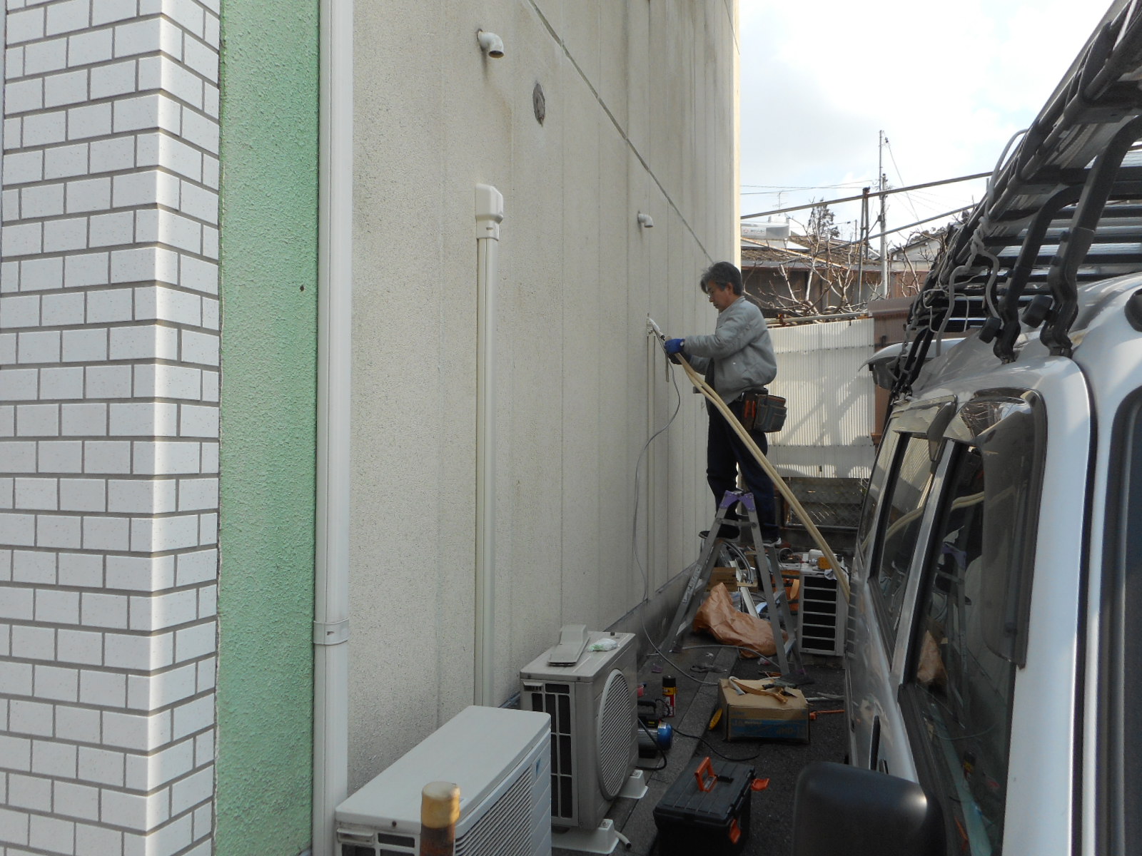 | 内装工事が終わったら、エアコンを2台取付け、電話配線の改修もします!! | エアコンの室外の、取付け工事をしています!! |