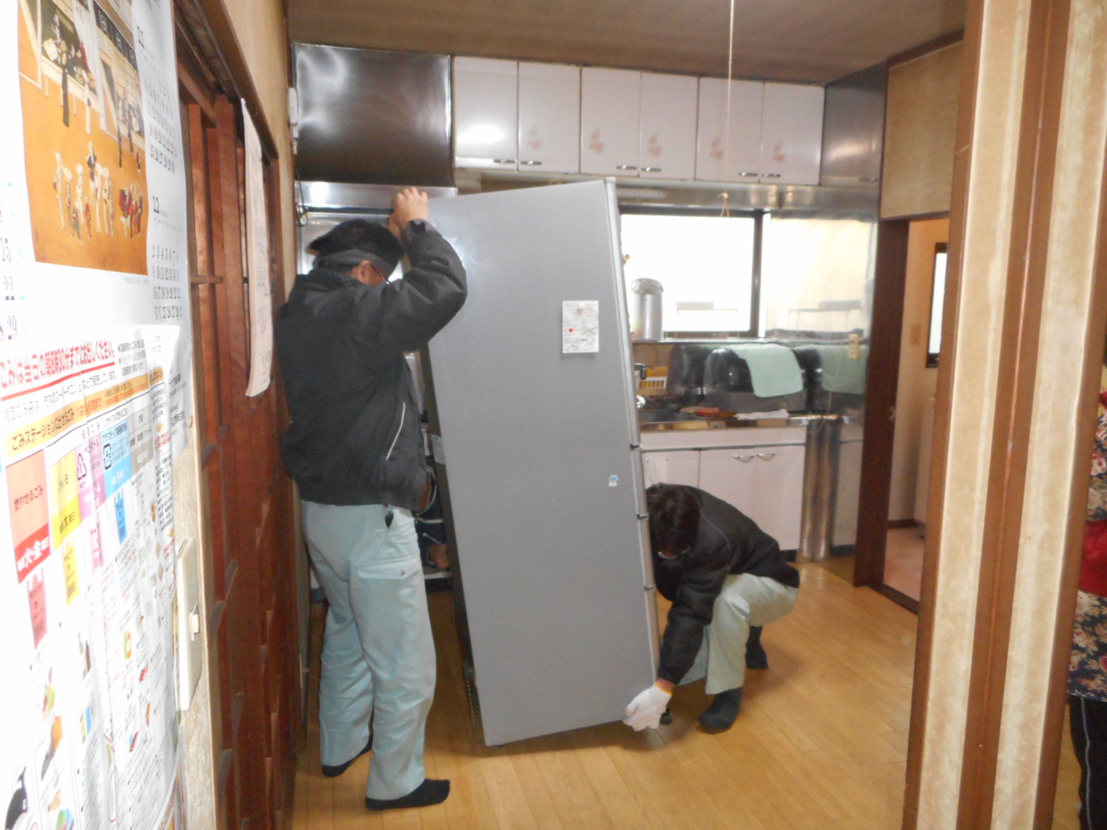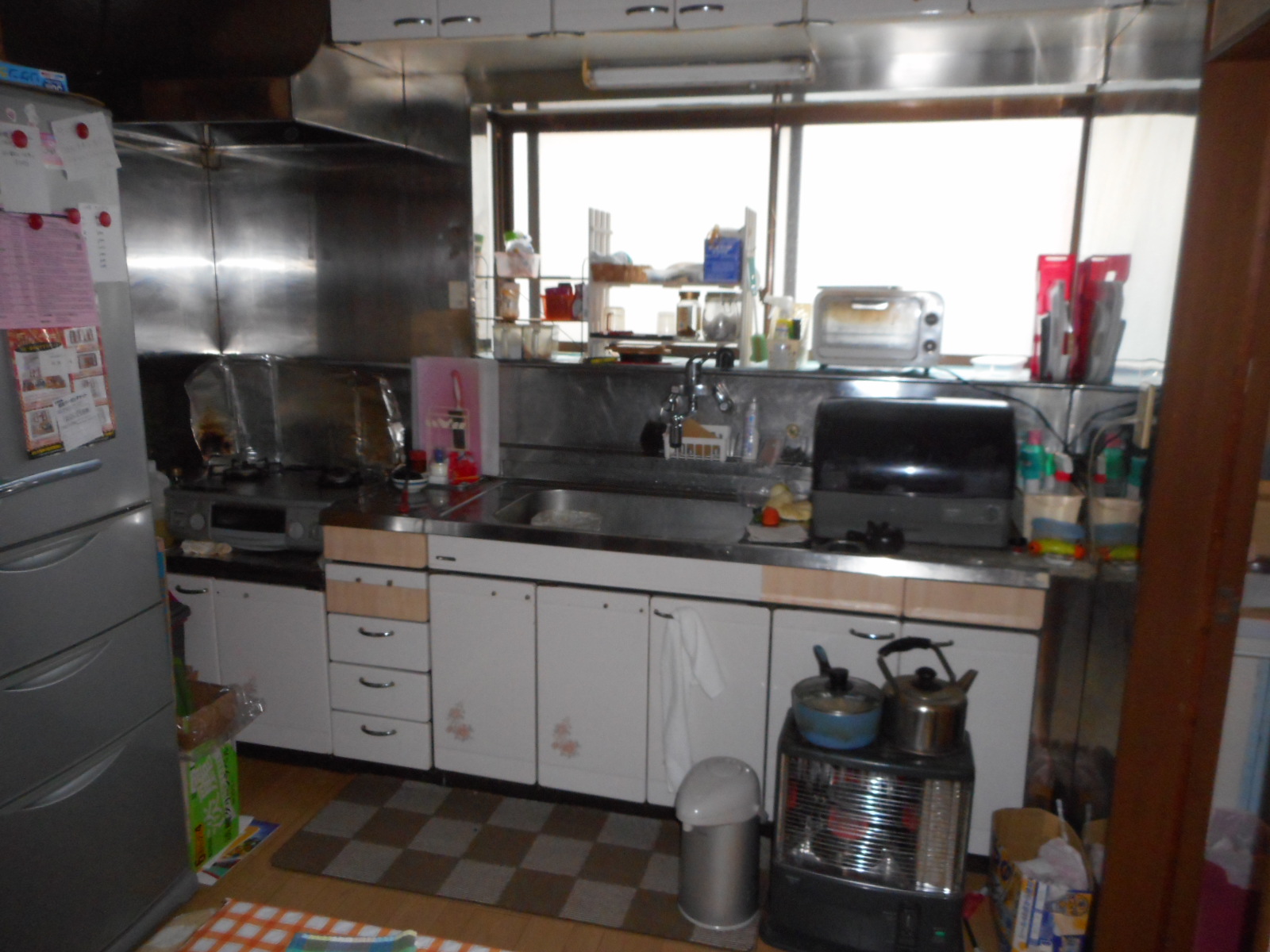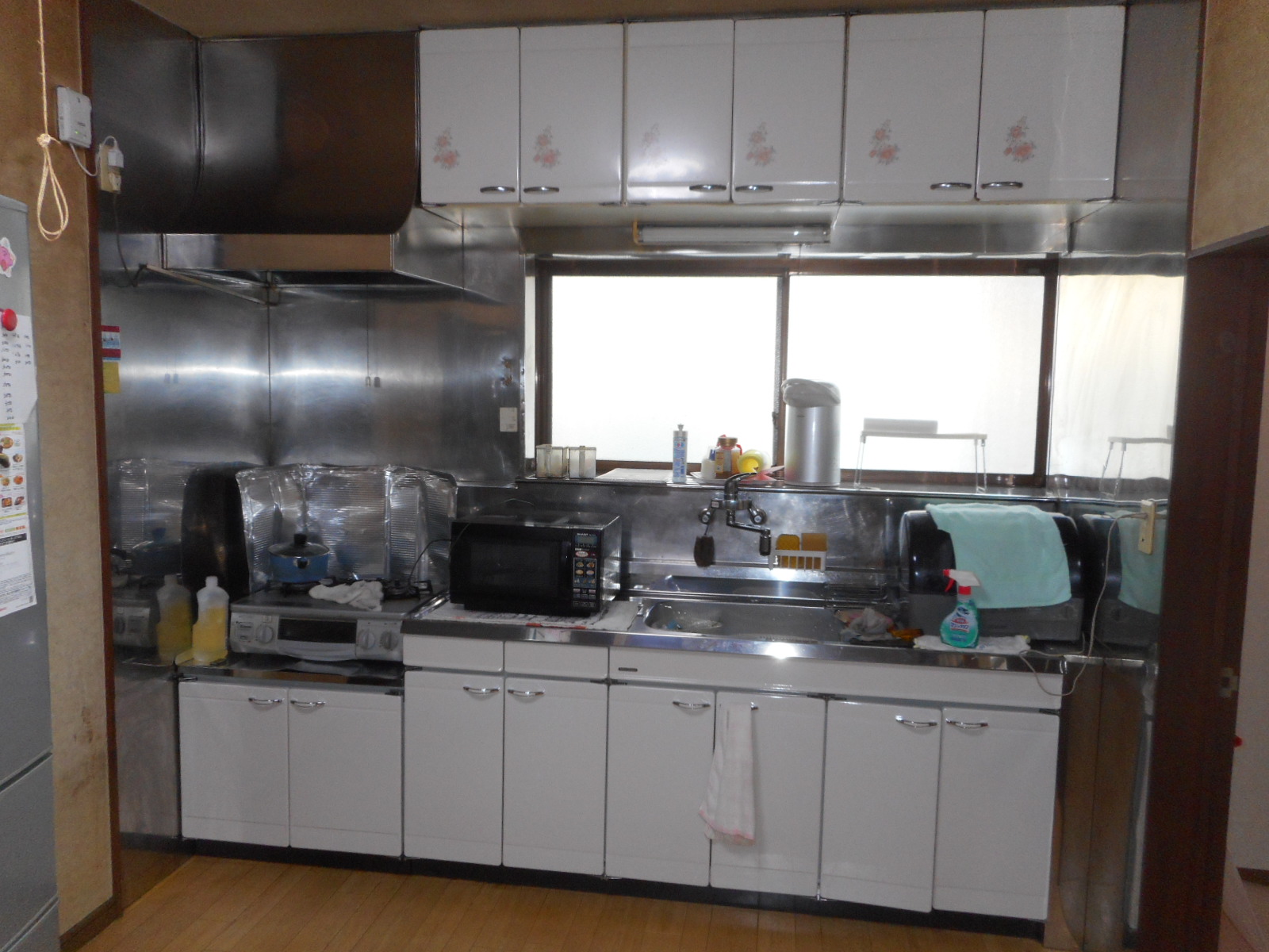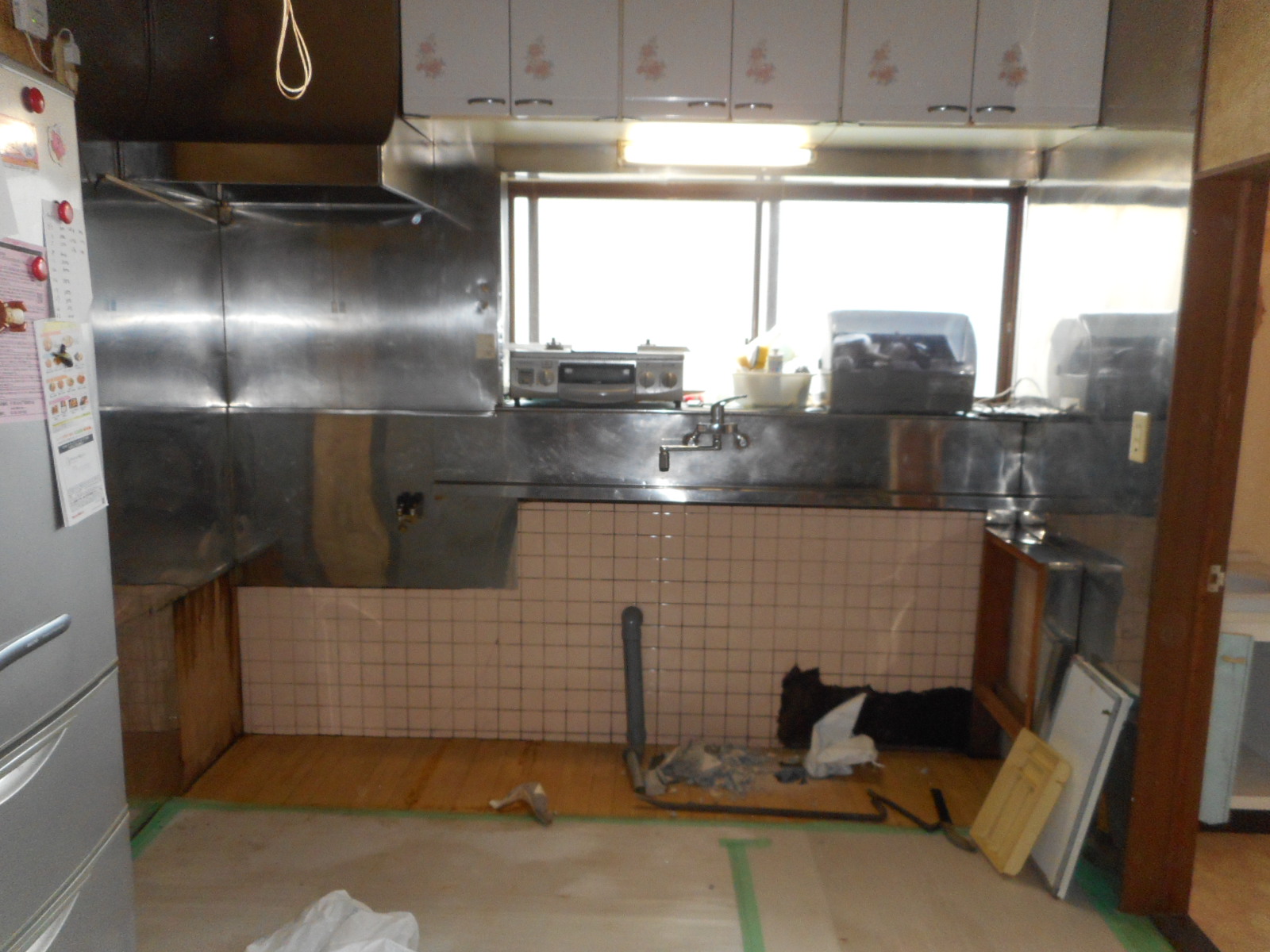 | 既存の流し台を撤去し、排水管の移設,整備をしました!! | 新規流し台を組付け、冷蔵庫等を元に戻します!! |