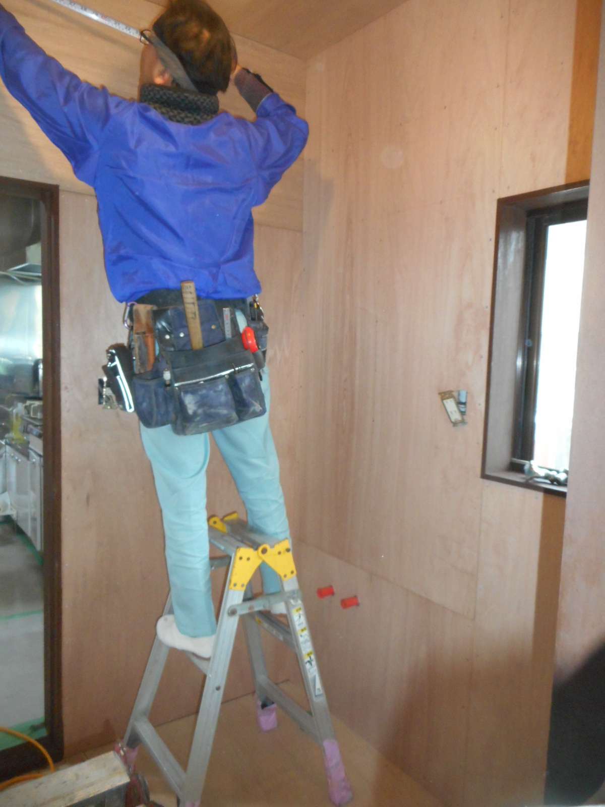 | 既存の化粧台を解体、撤去します!! | 天井と壁廻りに、クロス下地のベニヤを施工します!! |