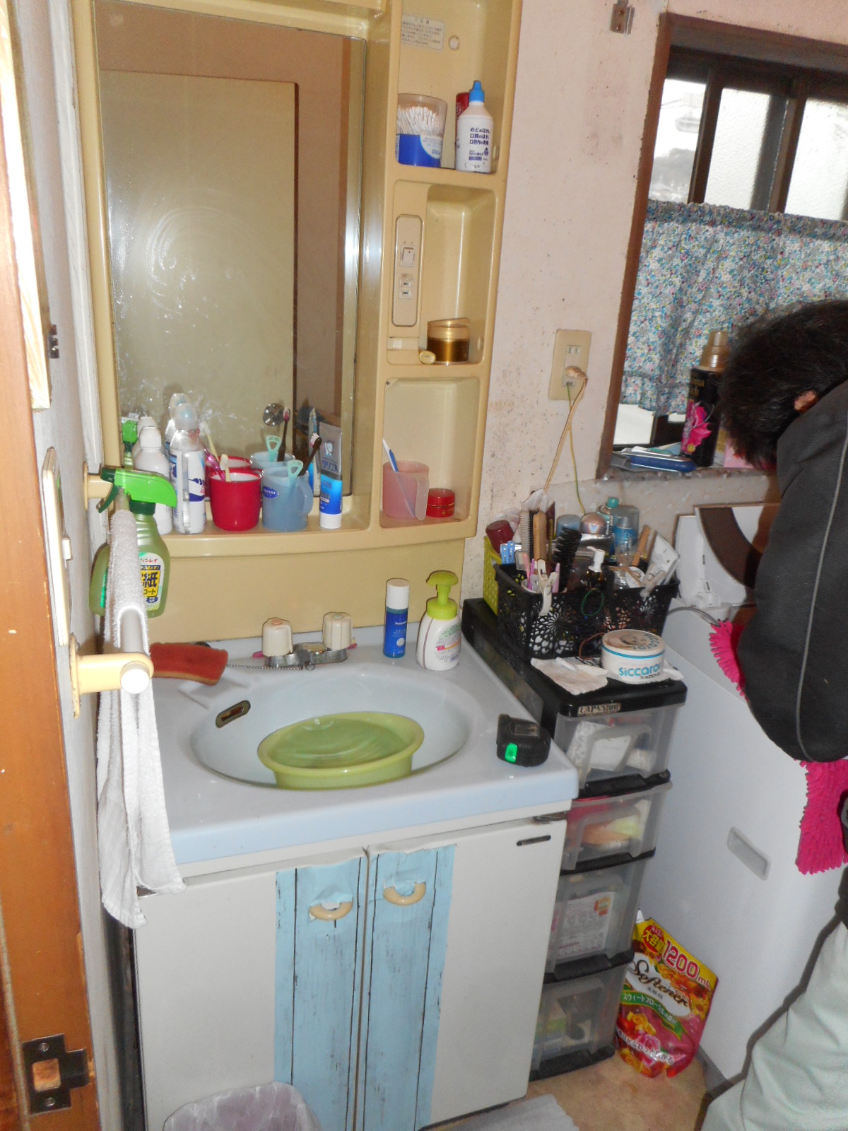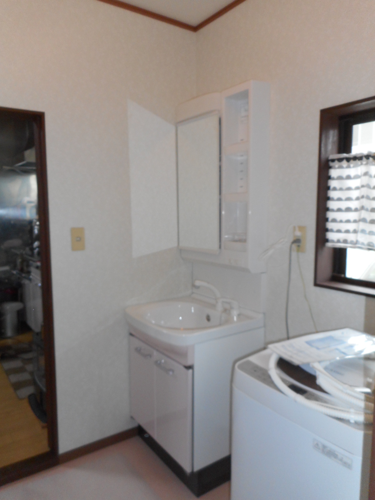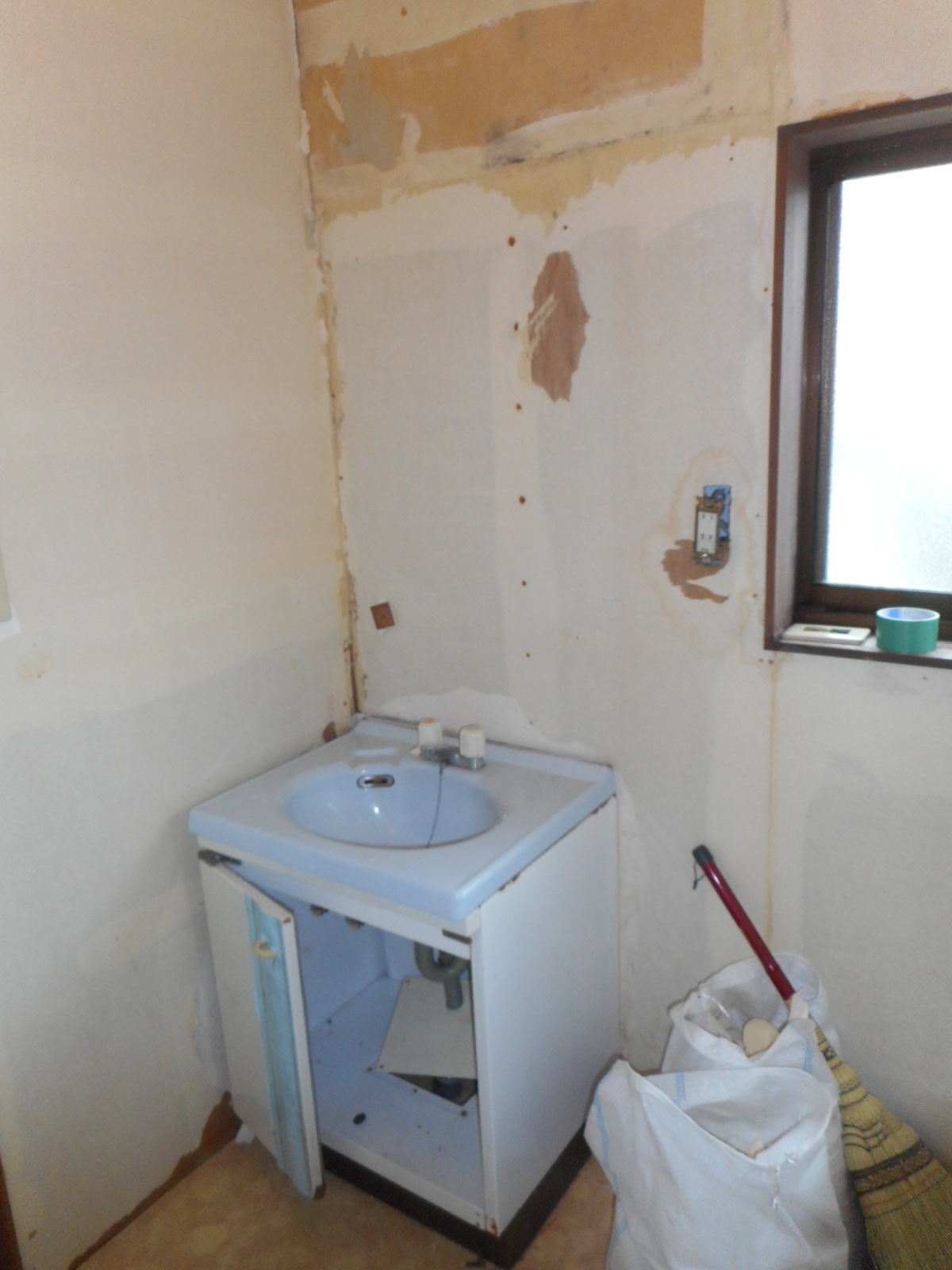 老朽化した洗面化粧台を交換し、以前の雨漏れで状態が悪くなった天井と壁廻りのクロスと